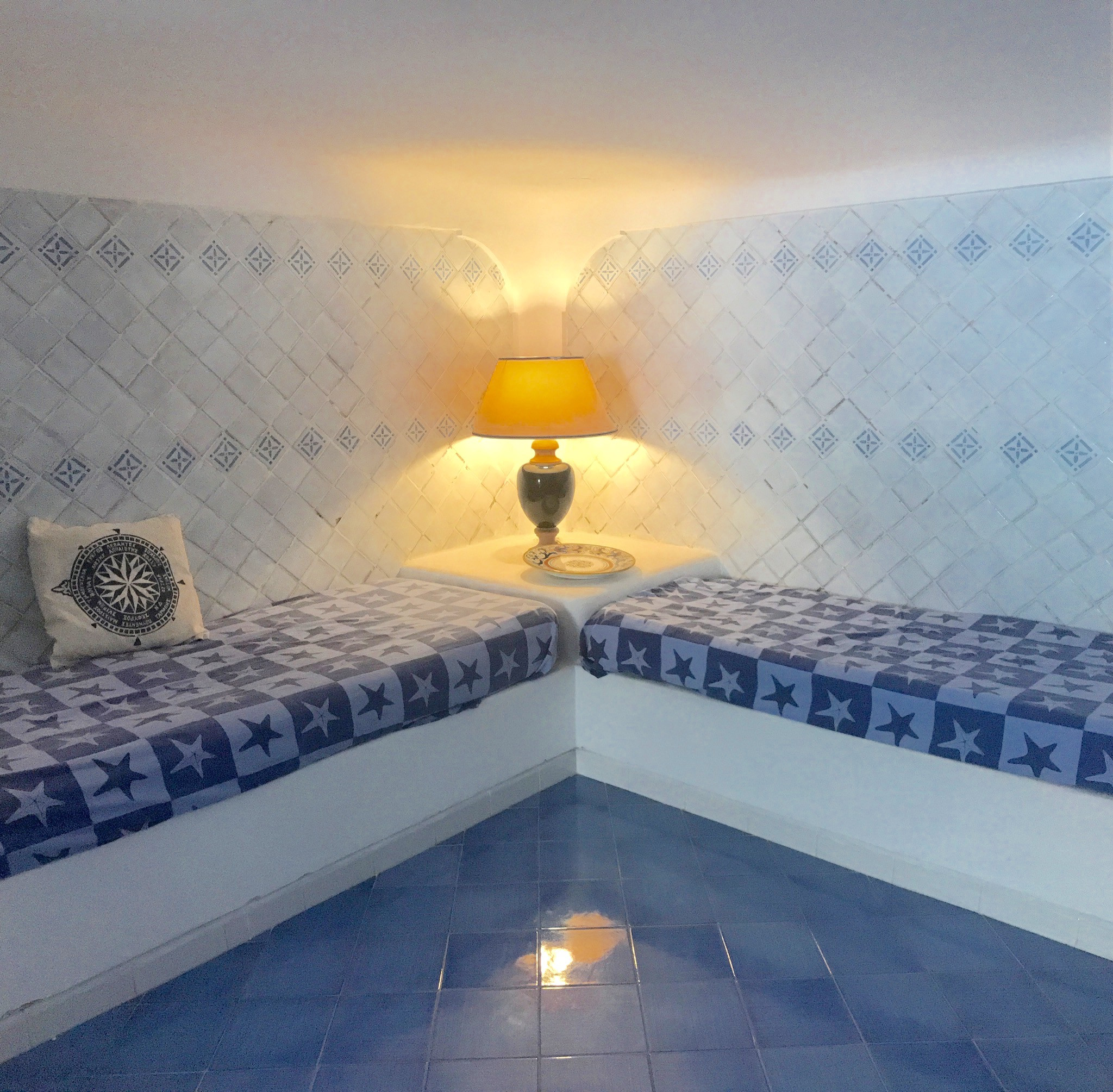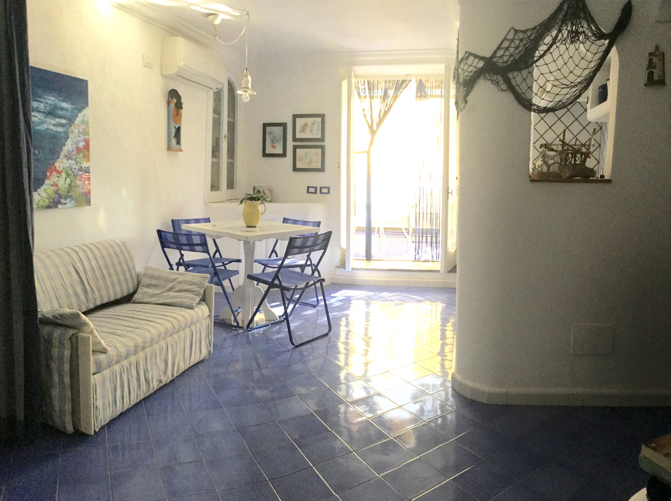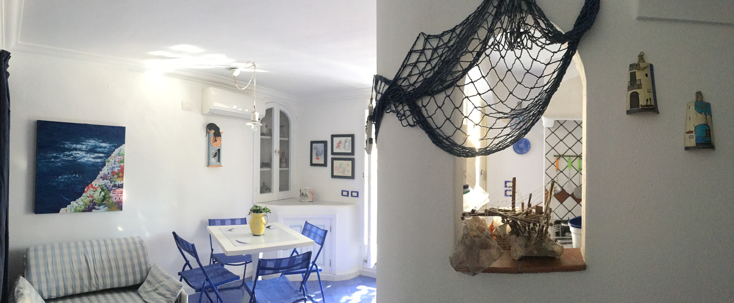 Al entrar nos encontramos con un luminoso salón compuesto por comedor equipado con mesa y sillas para cuatro personas, sofá de tela color aguamarina, smart TV de pantalla plana de 55 pulgadas, cocina americana con encimera de gas, doble fregadero de acero, tostadora y hervidor de agua, microondas. y horno eléctrico, campana extractora y cafetera de monodosis. El salón está decorado en tonos verde mar, azul claro y azul, con cerámica típica de Vietri. El salón conduce al gran dormitorio: se caracteriza por techos abovedados, un balcón con vistas al mar y se compone de dos grandes espacios compartidos.