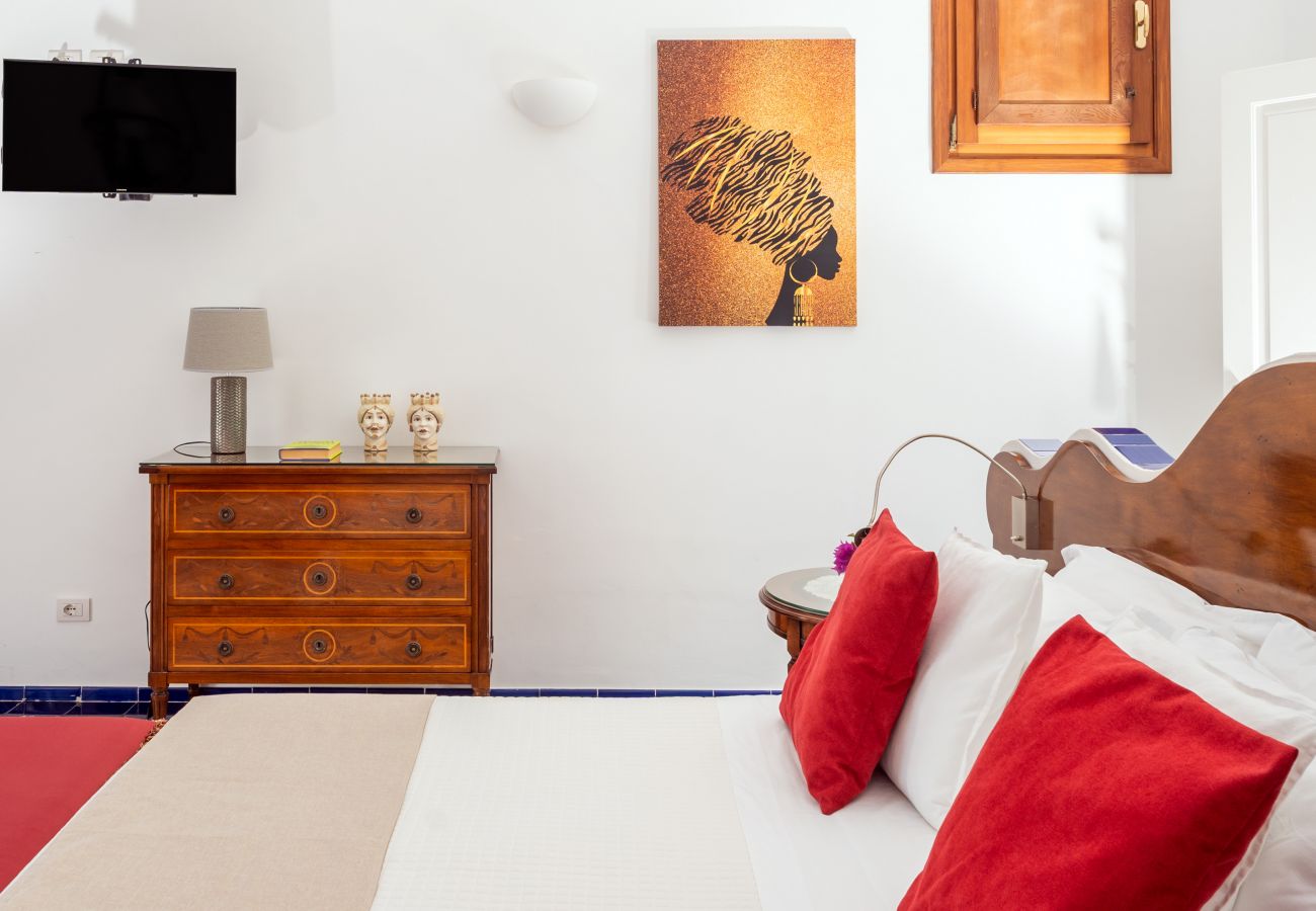 • Suite Sunrise con baño privado con jacuzzi: esta suite de lujo cuenta con una gran terraza privada de unos 40 m2. metros con vistas a la hermosa bahía de Amalfi. La Suite Sunrise es una habitación muy exclusiva con sala de estar con vista al mar separada del dormitorio para mayor privacidad y comodidad, pasillo de piedra y baño con jacuzzi. Los muebles son obras únicas de la tradición napolitana; el antiguo piso de terracota y la mayólica verde del mar en estilo Vietri hacen de esta suite la más prestigiosa de la villa. A petición, la posibilidad de dos camas adicionales.