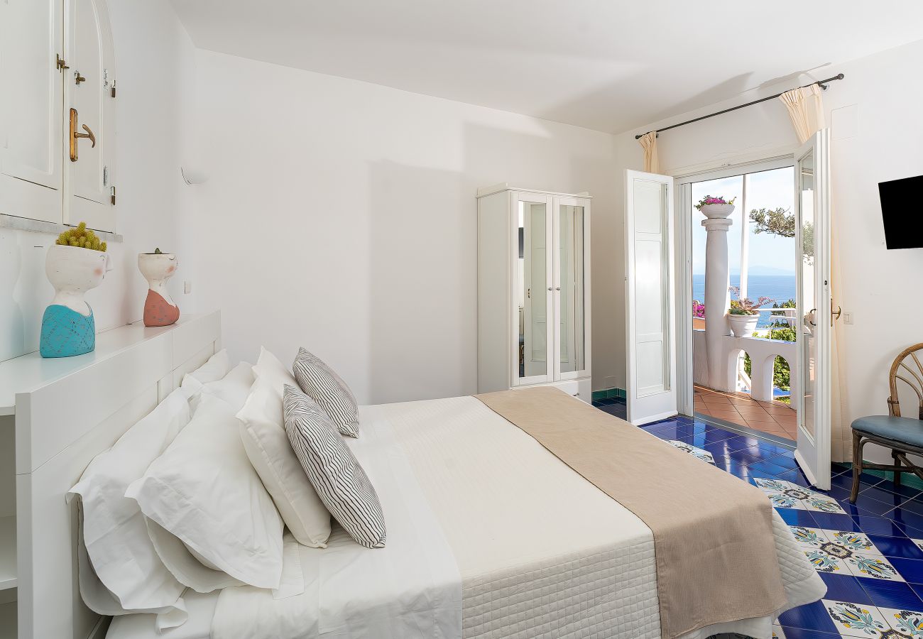 • La Tower Suite, originalmente una torre de vigilancia. La suite está ubicada en la parte superior de la villa y cuenta con una terraza solarium privada de aproximadamente 100 metros cuadrados. metros con una impresionante vista de 360 ° de la costa de Amalfi. La habitación parece un ático encantador, con una elegante sala de estar y un baño de mármol del Vesubio. Tiene suelos de terracota antiguos, sedas naturales de Maratea y muebles de diseño, así como un techo radiante con preciosos candelabros. A petición, posibilidad de cama supletoria.