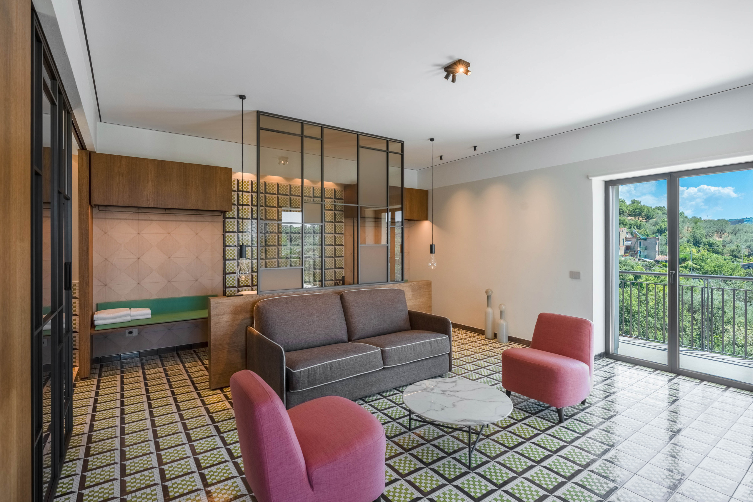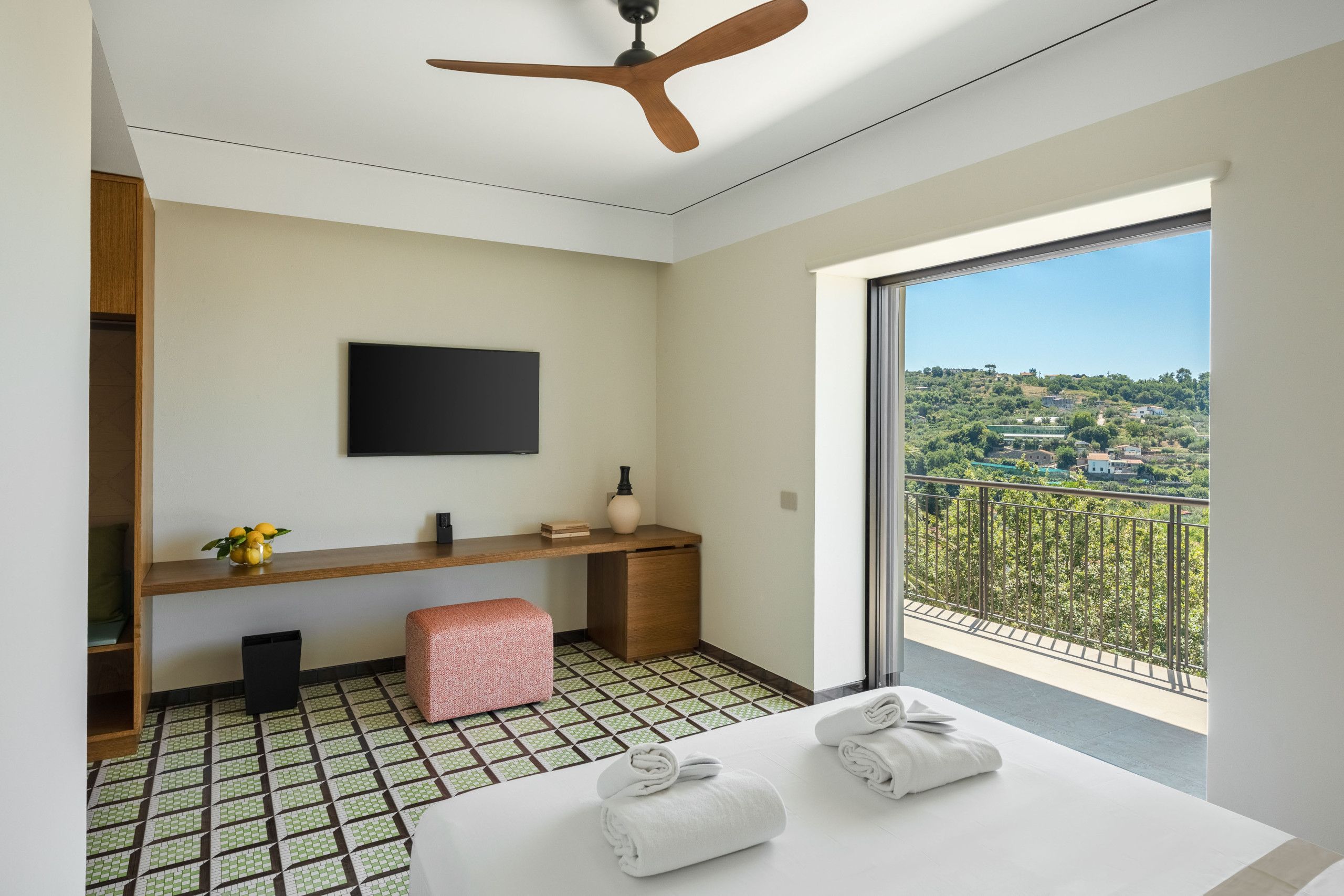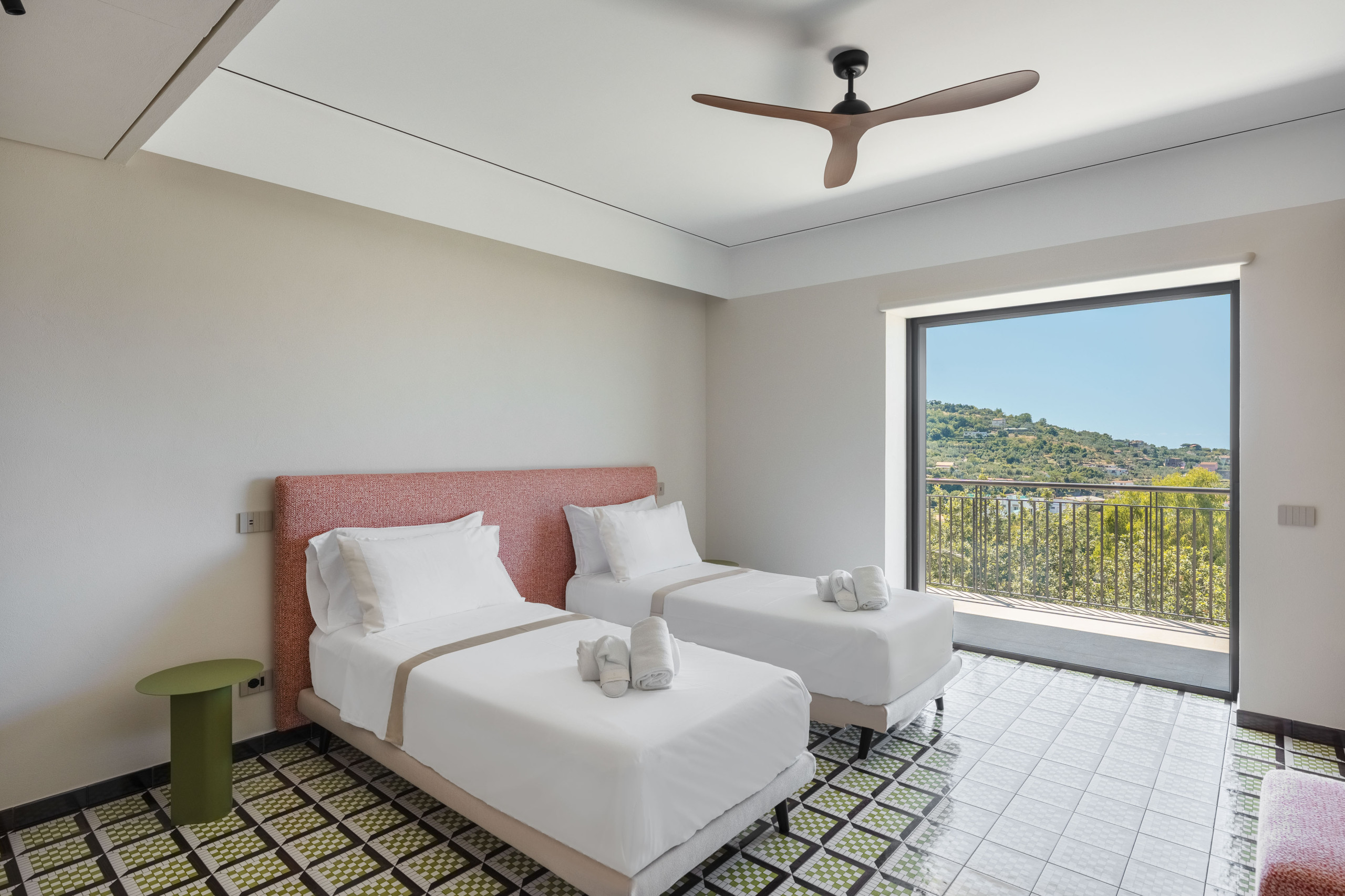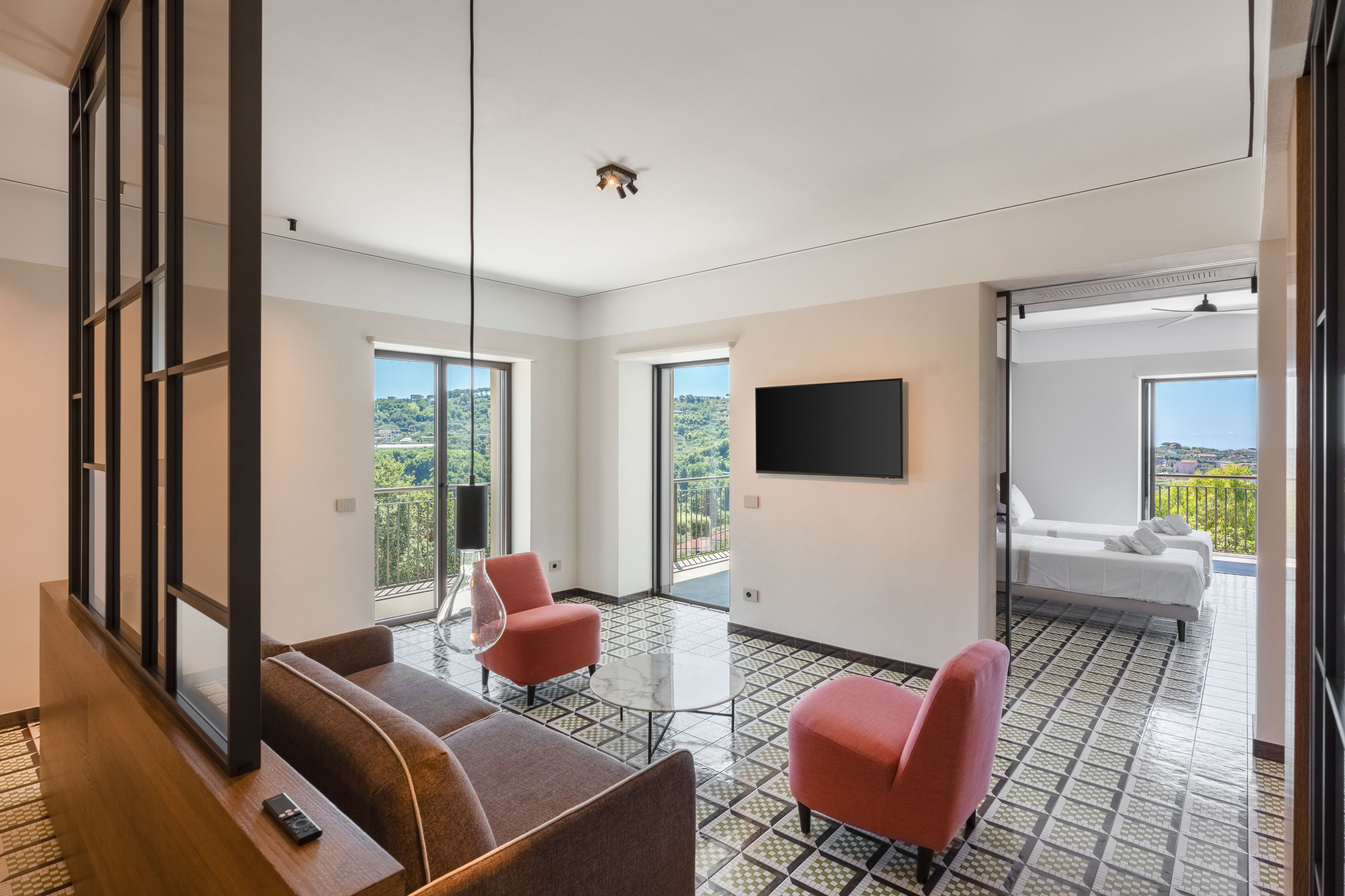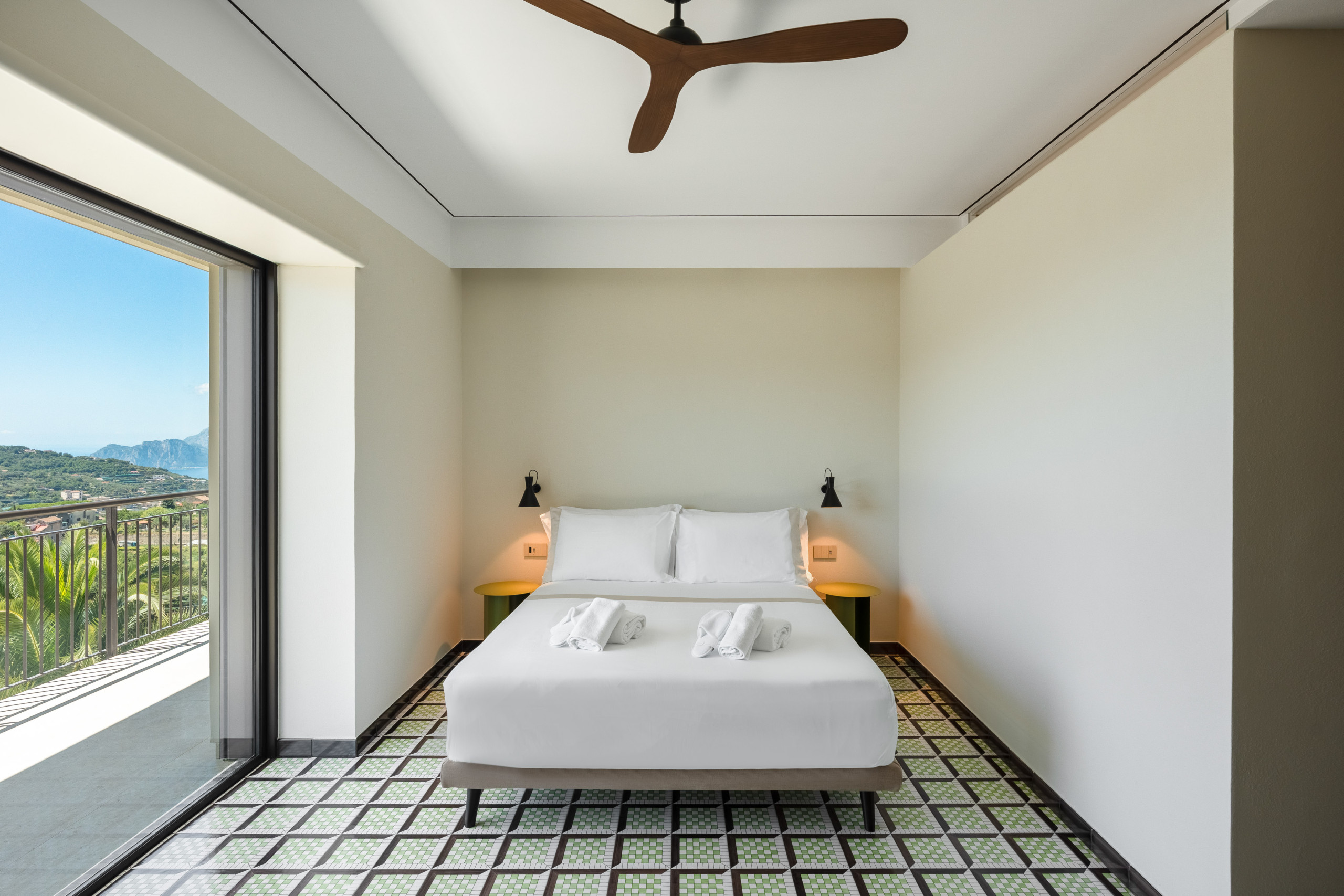La segunda planta es idéntica a la primera, por lo que tenemos tres habitaciones divididas de la misma manera, con la única variación del color del hermoso pavimento de baldosas de Vietri.