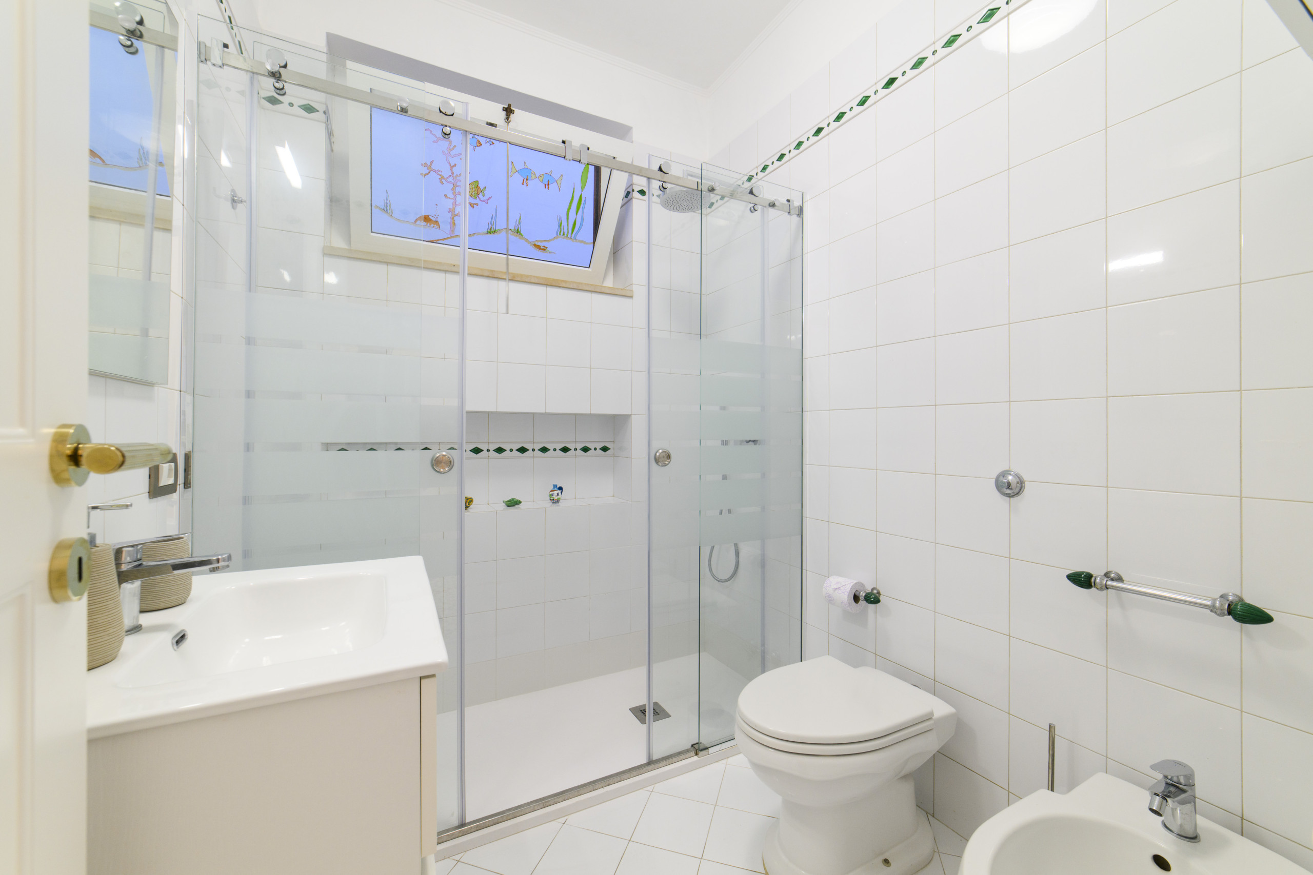 Salle de bain double, une avec baignoire et l'autre avec douche, bidet et toilettes. Deux chambres, une double avec balcon vue mer et une chambre twin avec deux lits simples qui peuvent devenir doubles si besoin.