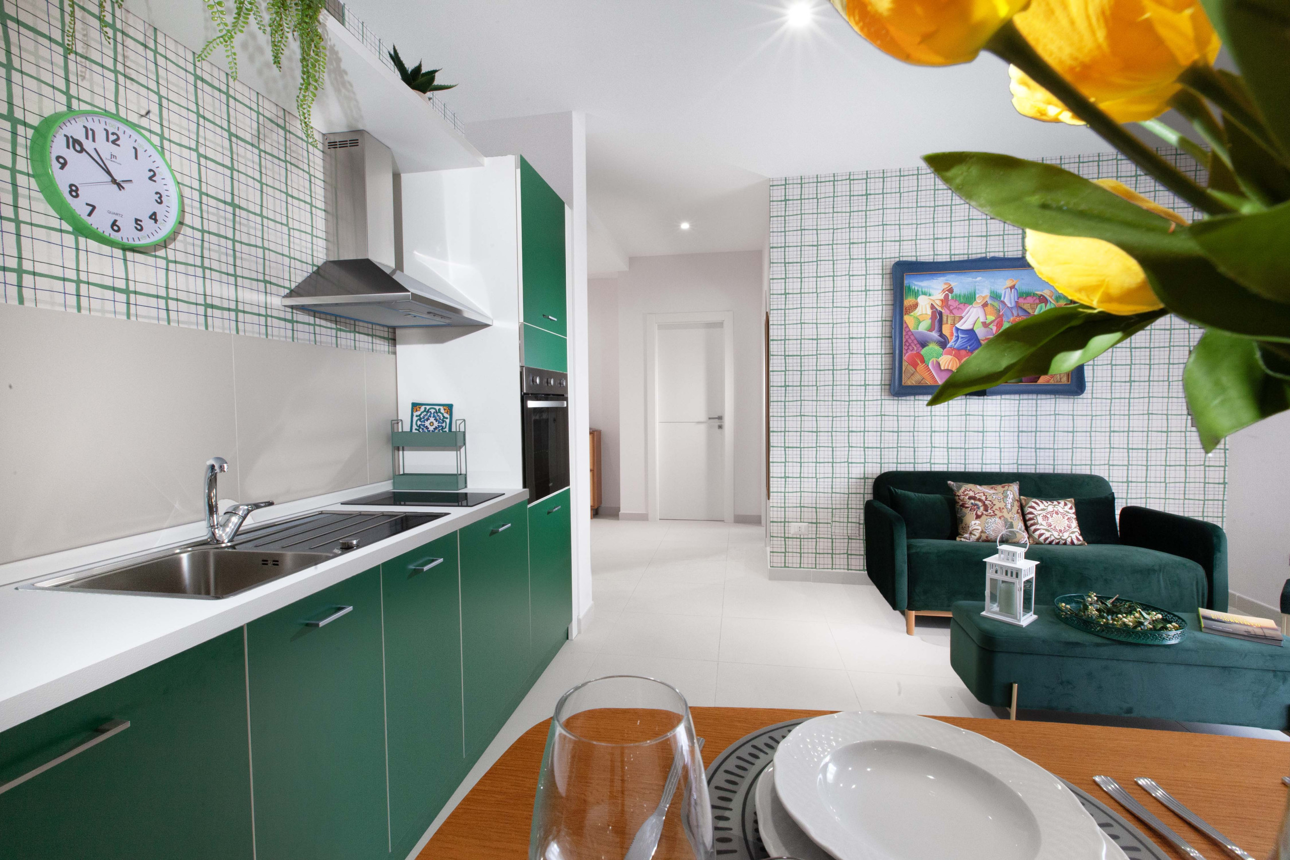 L'appartement, meublé dans un style raffiné des années 50 avec des tons délicats de vert et de rose, offre une atmosphère chaleureuse et recherchée. Il est composé d'un salon lumineux avec une cuisine américaine entièrement équipée comprenant une plaque de cuisson à deux feux à induction, un évier, un réfrigérateur, un lave-vaisselle. Une chambre lumineuse avec un lit king-size confortable, une salle de bain spacieuse, moderne et fonctionnelle avec toilettes, bidet avec douchette, grande douche walk-in, machine à laver et grand lavabo. Les meubles personnalisés mettent en valeur chaque espace avec caractère et unicité.