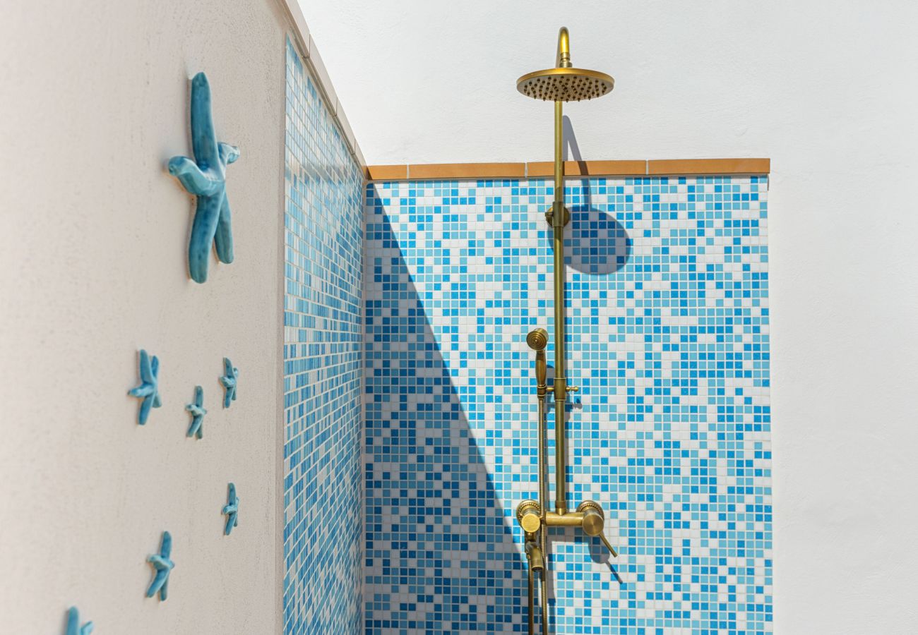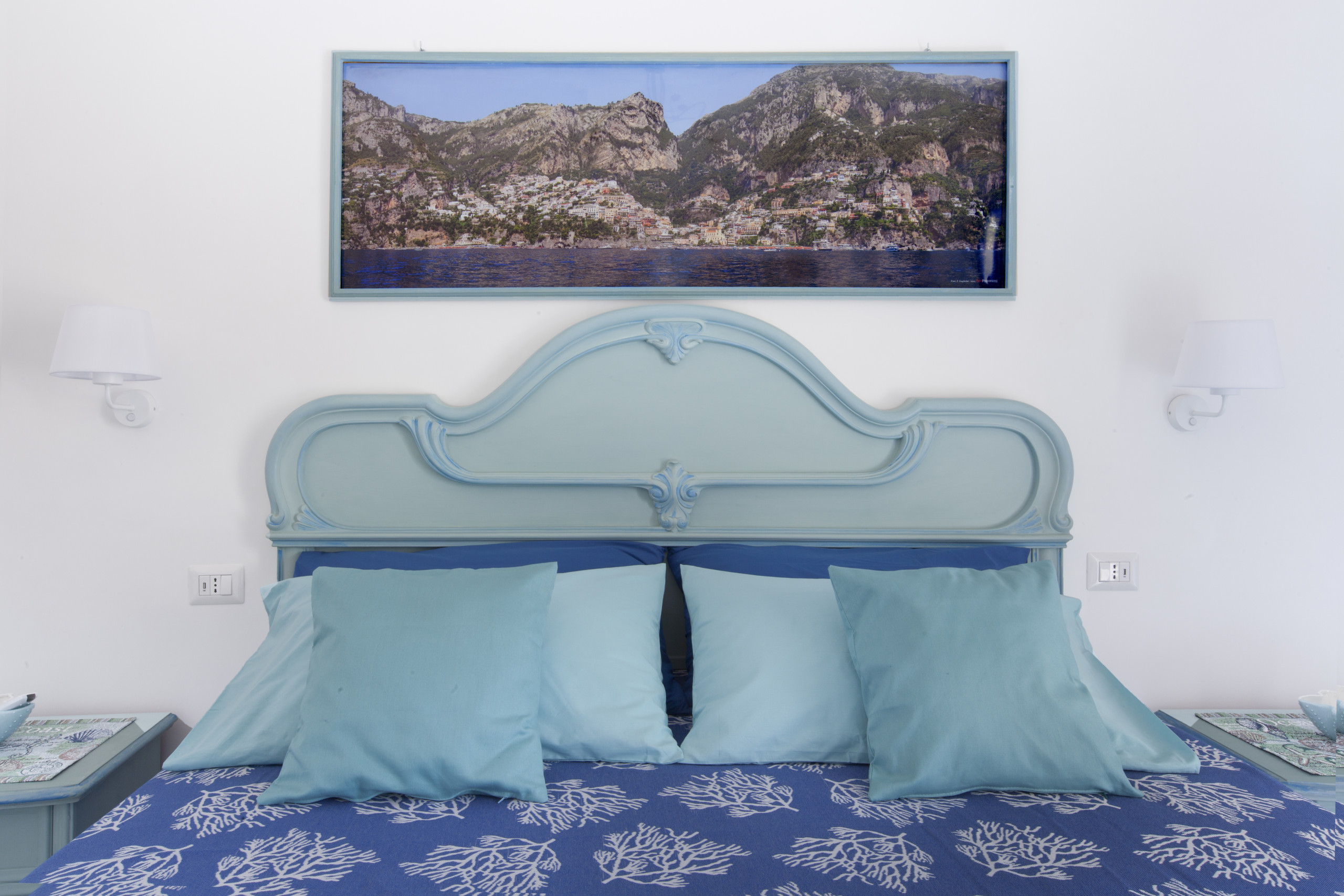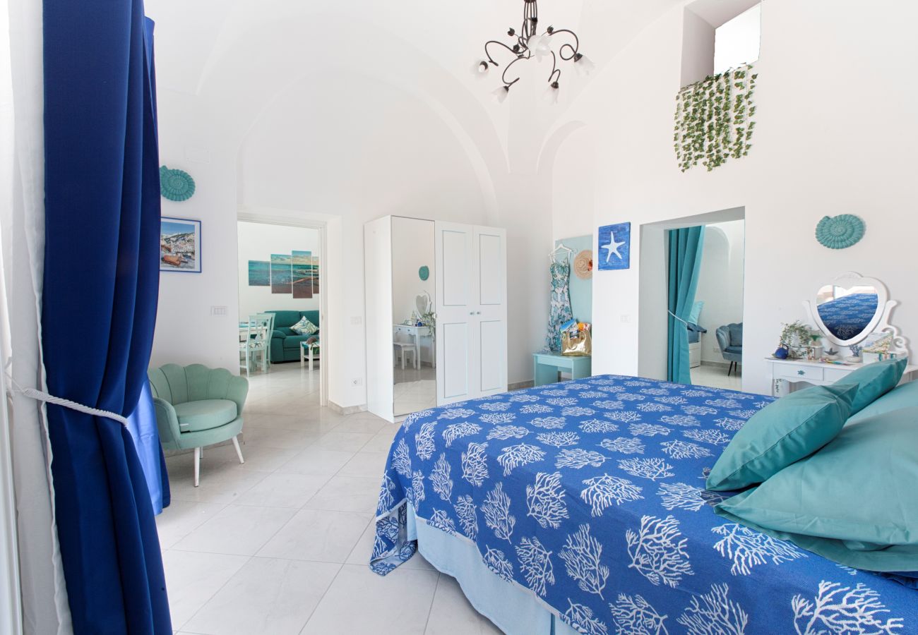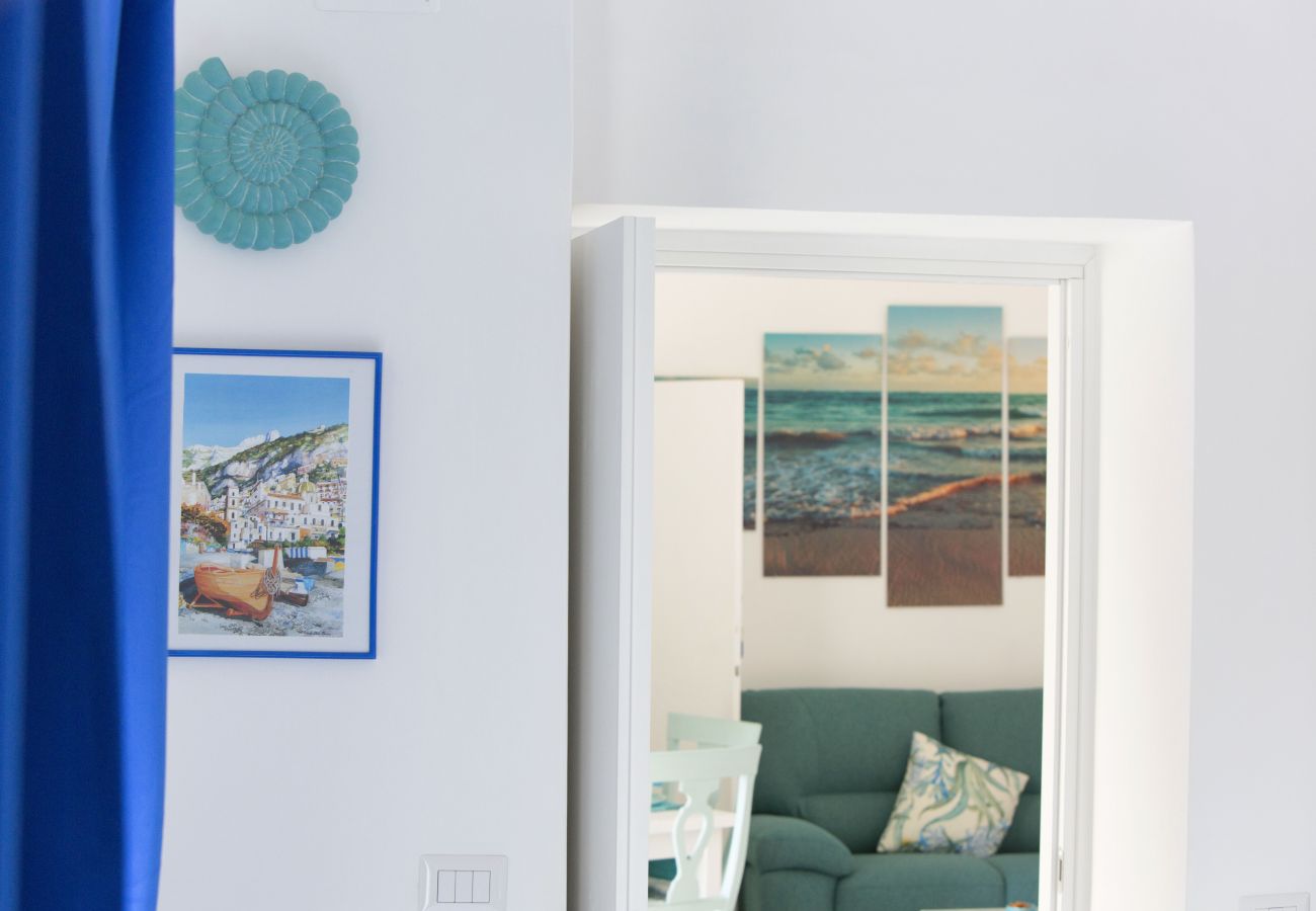 En entrant, nous trouvons un séjour lumineux composé d'une salle à manger équipée d'une table et de chaises pour quatre personnes, d'un canapé en tissu aigue-marine, d'une smart TV à écran plat de 55 pouces, d'une cuisine américaine avec plaque de cuisson à gaz, double évier en acier, grille-pain et bouilloire, micro-ondes. et four électrique, hotte aspirante et machine à café à dosettes. Le salon est meublé dans des tons vert d'eau, bleu clair et bleu, avec des céramiques typiques de Vietri. Le salon mène à la grande chambre : celle-ci se caractérise par des plafonds voûtés, un balcon avec vue sur la mer et se compose de deux grands espaces communs.