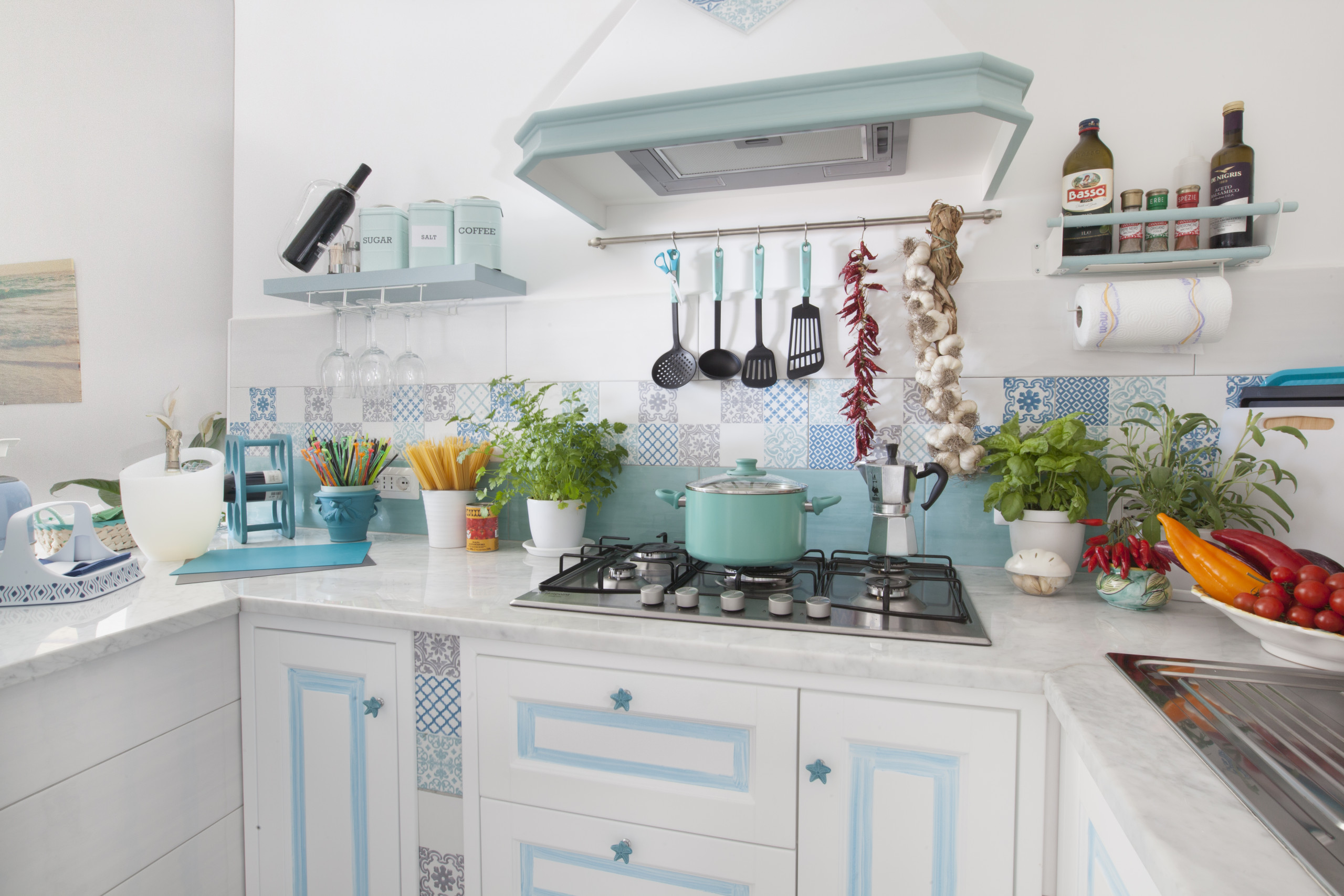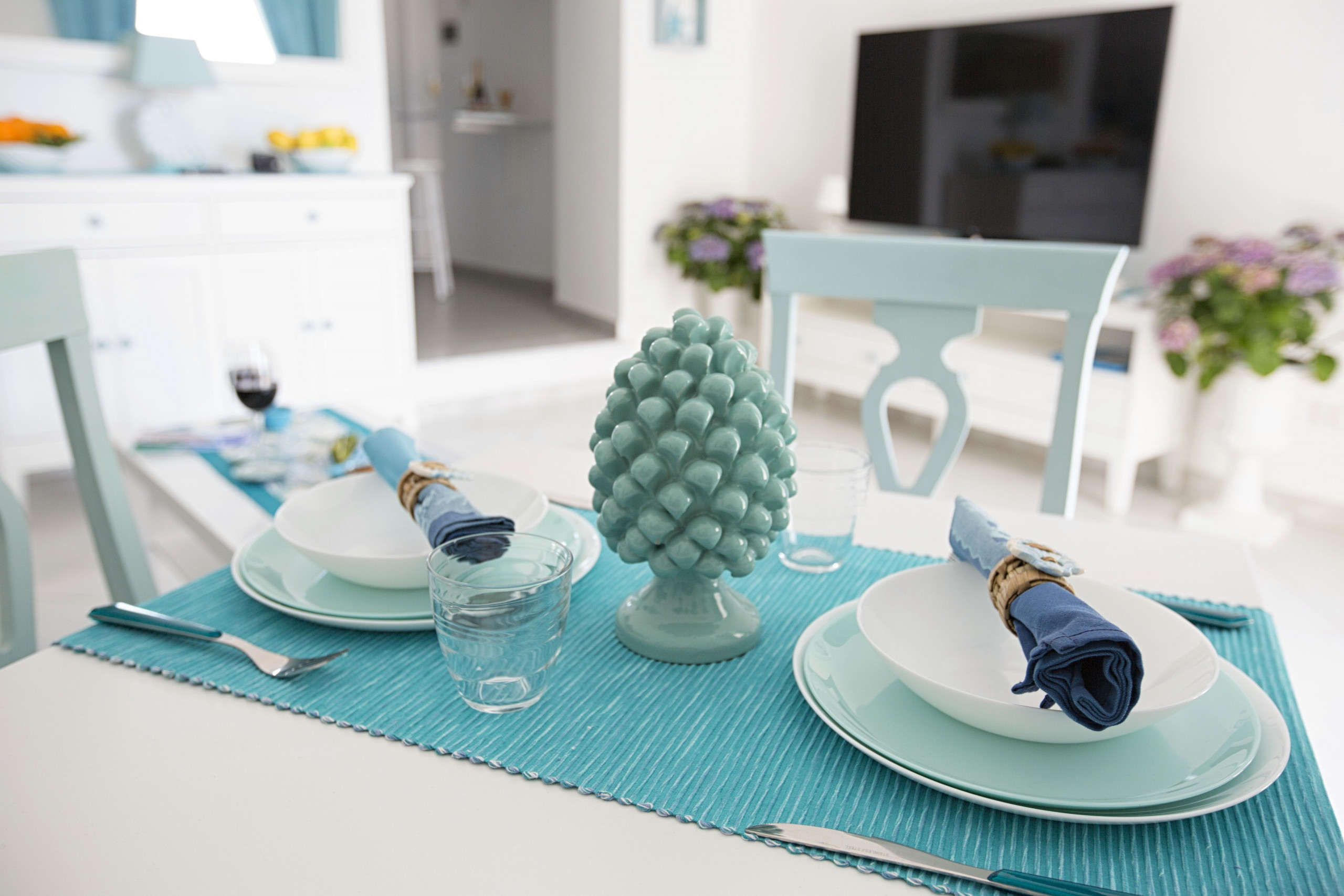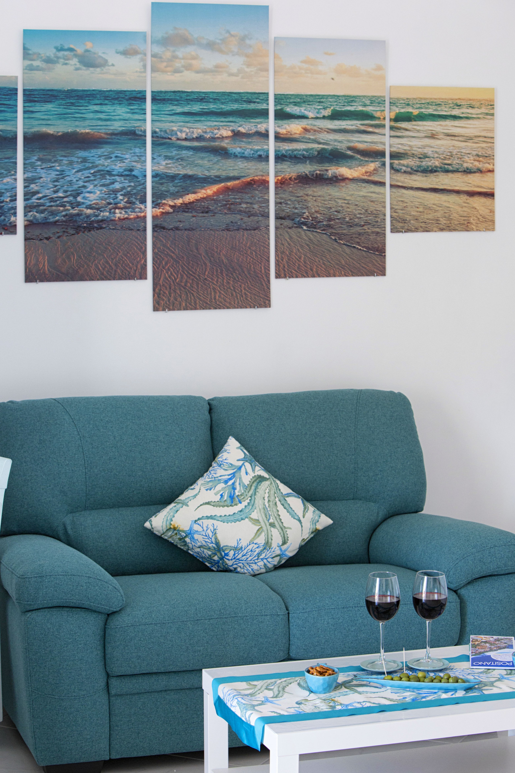 En entrant, nous trouvons un séjour lumineux composé d'une salle à manger équipée d'une table et de chaises pour quatre personnes, d'un canapé en tissu aigue-marine, d'une smart TV à écran plat de 55 pouces, d'une cuisine américaine avec plaque de cuisson à gaz, double évier en acier, grille-pain et bouilloire, micro-ondes. et four électrique, hotte aspirante et machine à café à dosettes. Le salon est meublé dans des tons vert d'eau, bleu clair et bleu, avec des céramiques typiques de Vietri. Le salon mène à la grande chambre : celle-ci se caractérise par des plafonds voûtés, un balcon avec vue sur la mer et se compose de deux grands espaces communs.