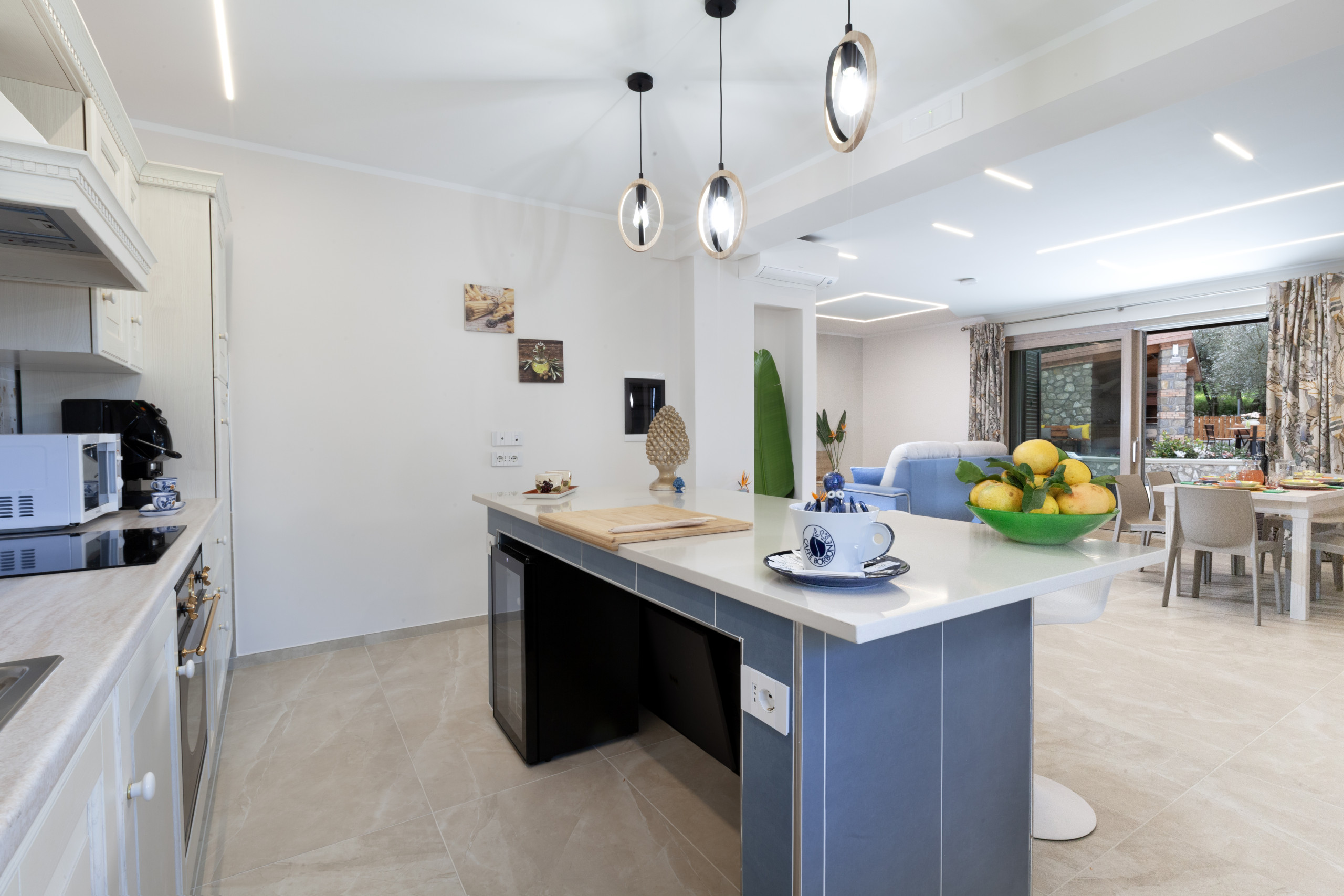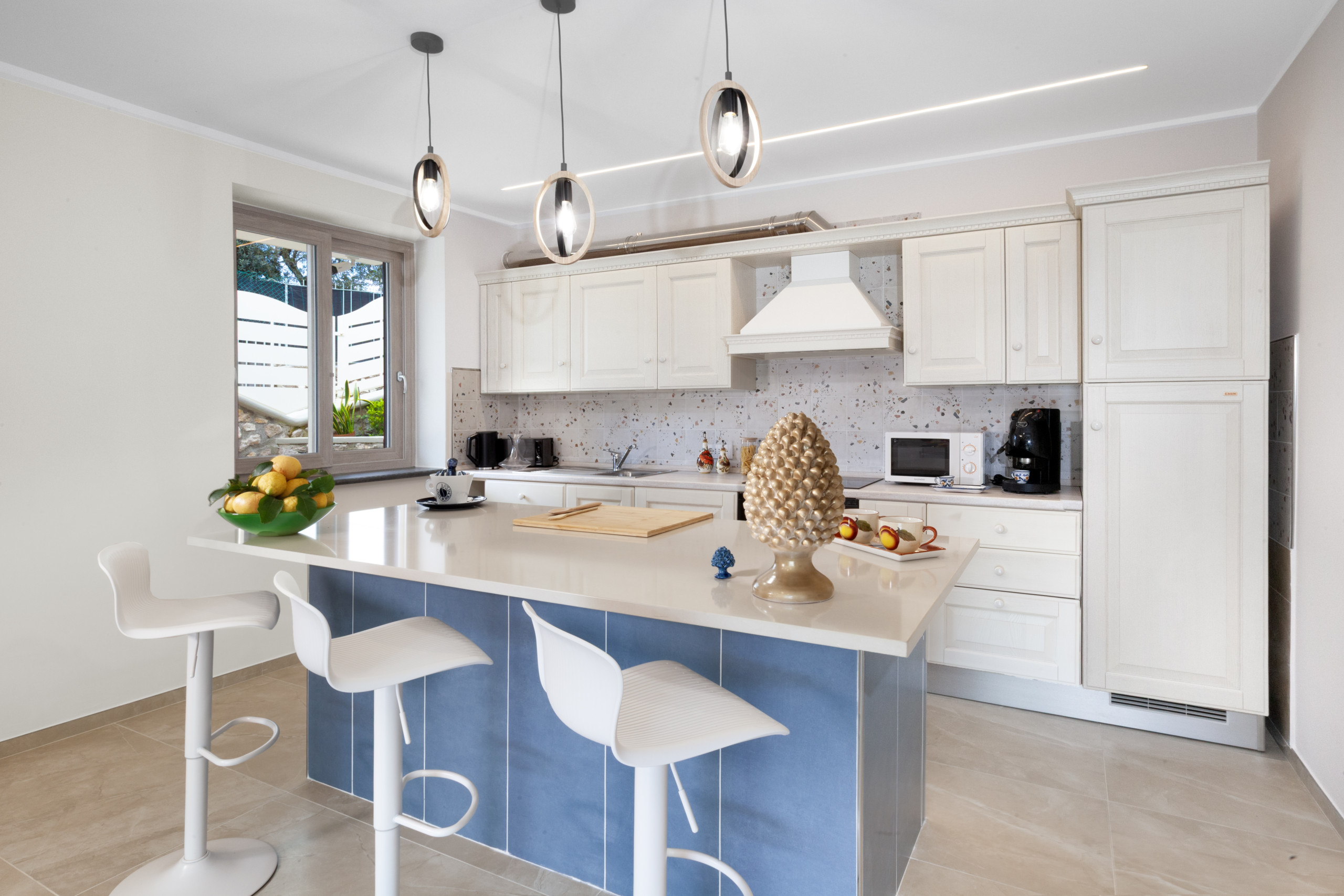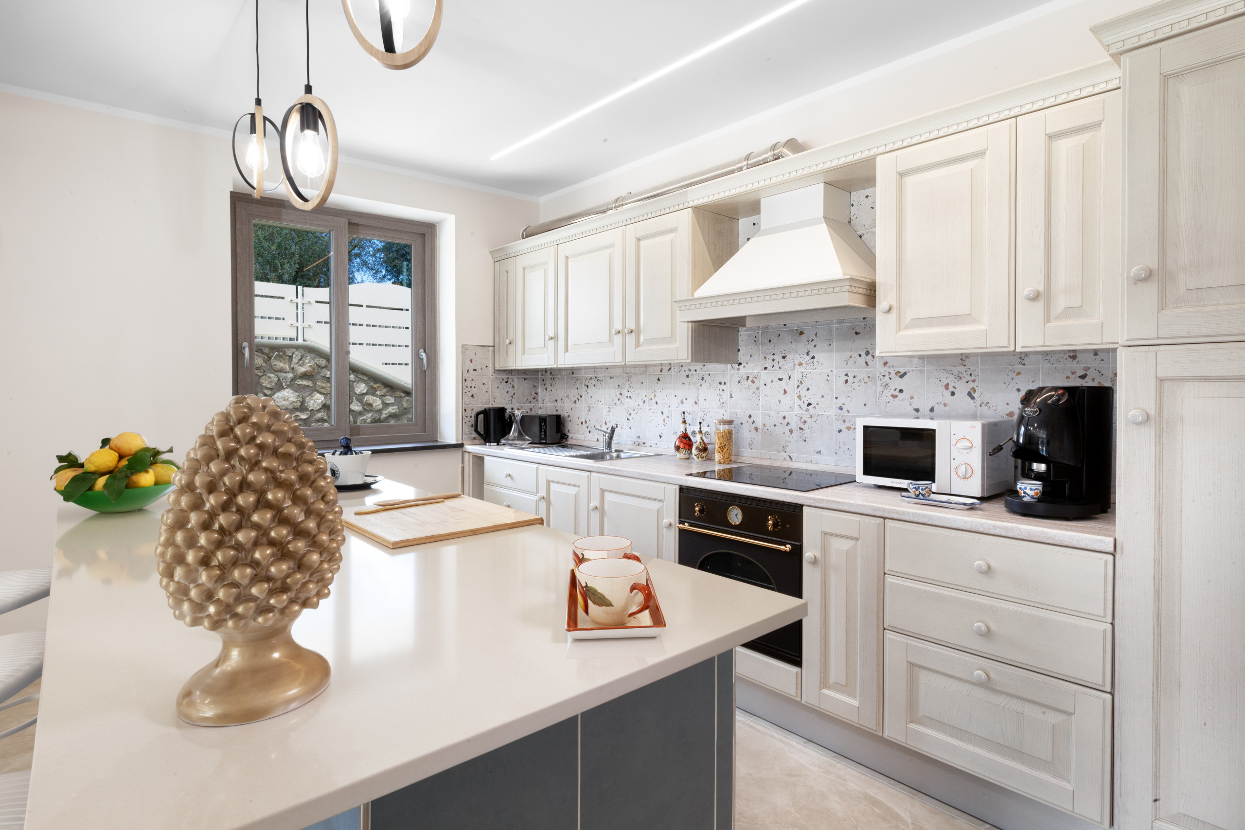 La cuisine, complètement neuve et équipée dans les moindres détails, est l'un des véritables points forts de la villa. Elle dispose d'une plaque à induction à cinq foyers, d'un four électrique, d'un four à micro-ondes, d'un réfrigérateur et d'un congélateur, d'un refroidisseur à vin, d'une machine à café à dosettes, d'une bouilloire et d'un grille-pain. Le grand plan de travail frontal la rend idéale non seulement pour cuisiner, mais aussi pour vivre de véritables expériences culinaires, comme des cours de cuisine organisés directement à la villa. À ce niveau se trouve également une salle de bain avec douche, lave-linge, sèche-linge, fer et planche à repasser.
