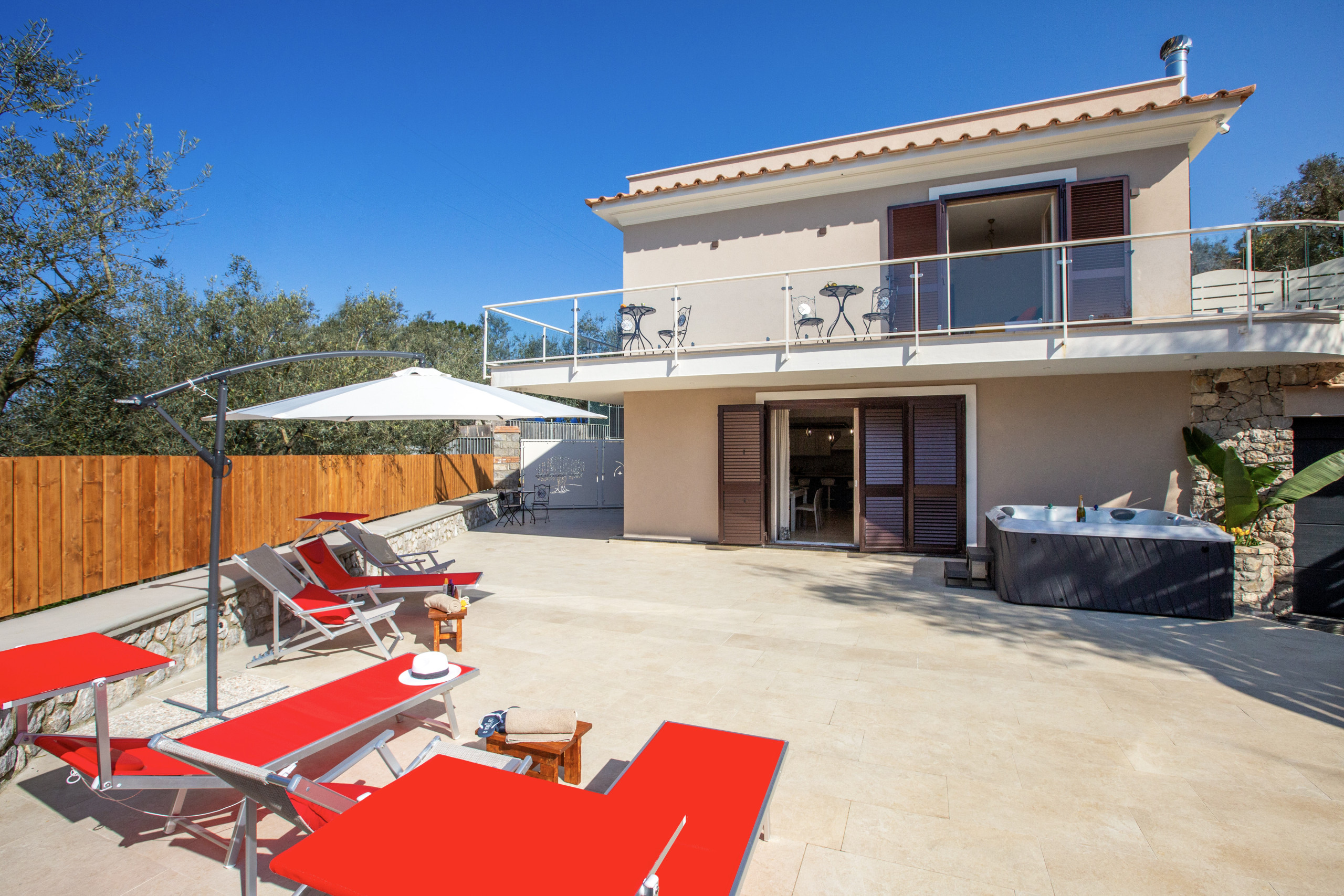 Les espaces extérieurs, d'environ 200 m², sont conçus pour profiter pleinement de la beauté du climat méditerranéen. La terrasse est équipée de chaises longues et de parasols, tandis que le bain à remous extérieur chauffé pour six personnes invite à la détente à tout moment de la journée.