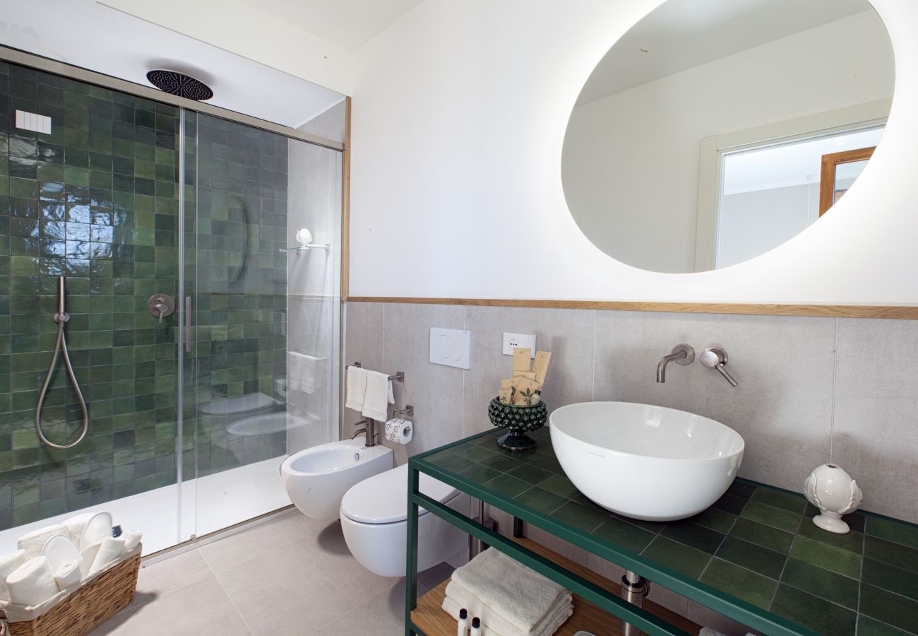 Ogni camera dispone di bagno privato in camera con ampia doccia walk-in, wc, bidet e lavandino con mobile in maioliche.