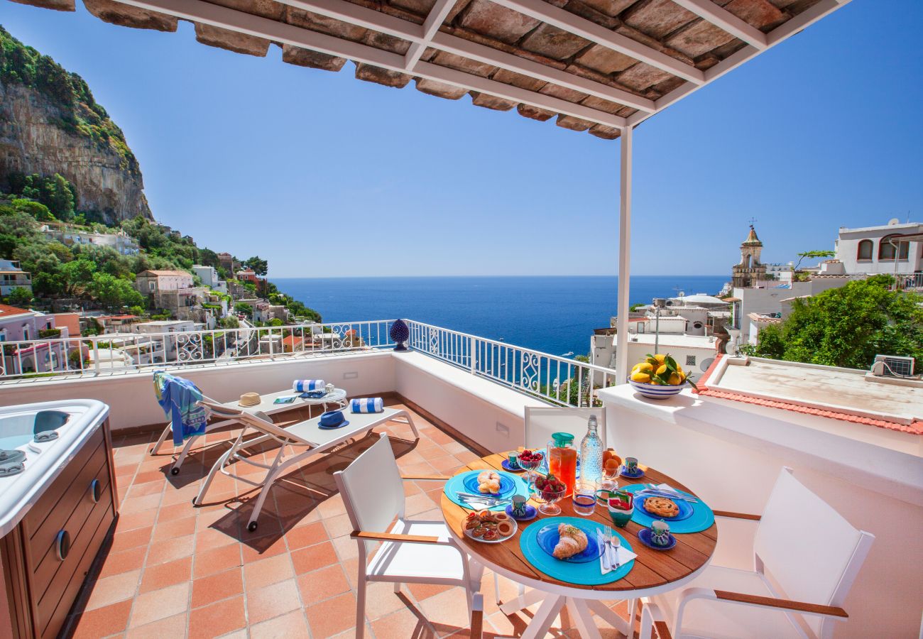L'ampia terrazza esterna gode di una meravigliosa vista mare, attrezzata con jacuzzi privata. lettini, tavolo con sedie, una location perfetta per serate rilassanti e cene romantiche. L'appartamento dispone di aria condizionata, WiFi e ferro da stiro.