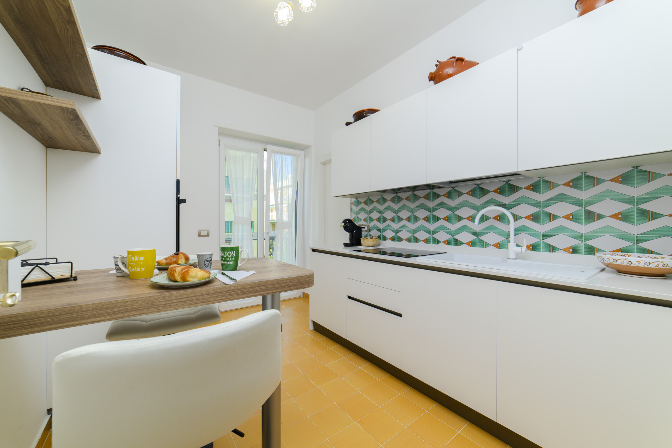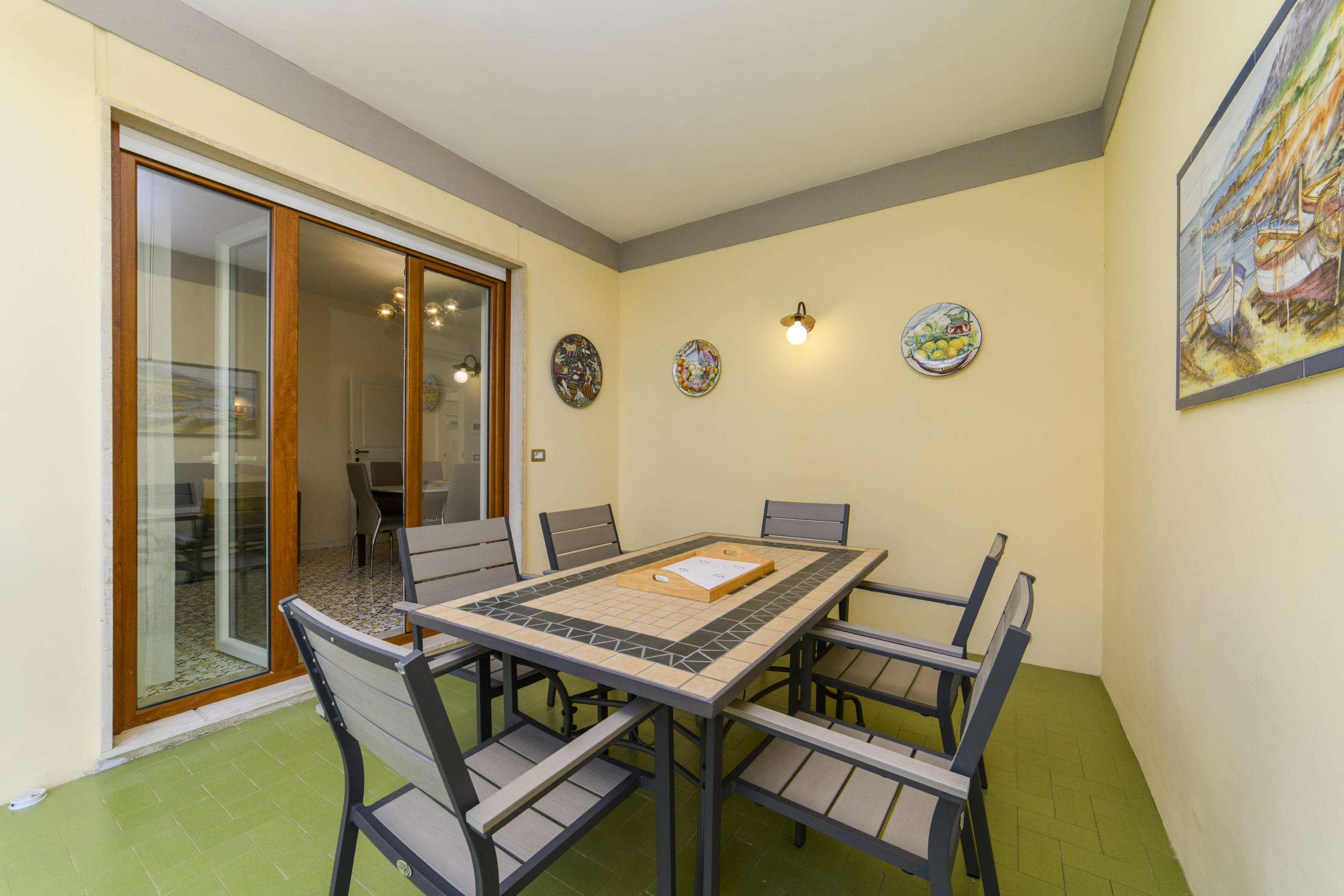 L'appartamento è composto da ingresso in soggiorno con grande open space, zona living con divano letto matrimoniale e smart tv di 50 pollici. Veranda coperta attrezzata come zona pranzo con tavolo per 6 poersone. Cucina lineare completa di piano ad induzione con 4 fuochi, forno, kettle, macchina del caffè con cialde, moka, lavastoviglie, frigo con congelatore.