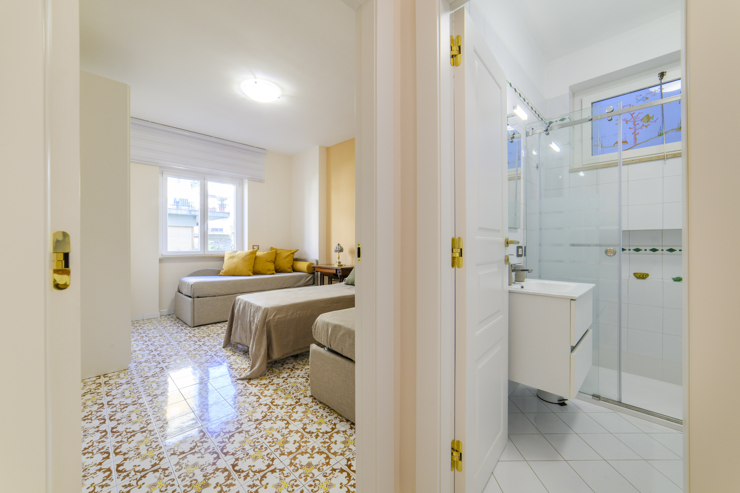 Doppio bagno di cui uno con vasca e l'altro con doccia, bidet e wc. Due camere da letto, una matrimoniale con balcone vista mare e camera twin con due letti singoli che all'occorrenza possono diventare matrimoniali.