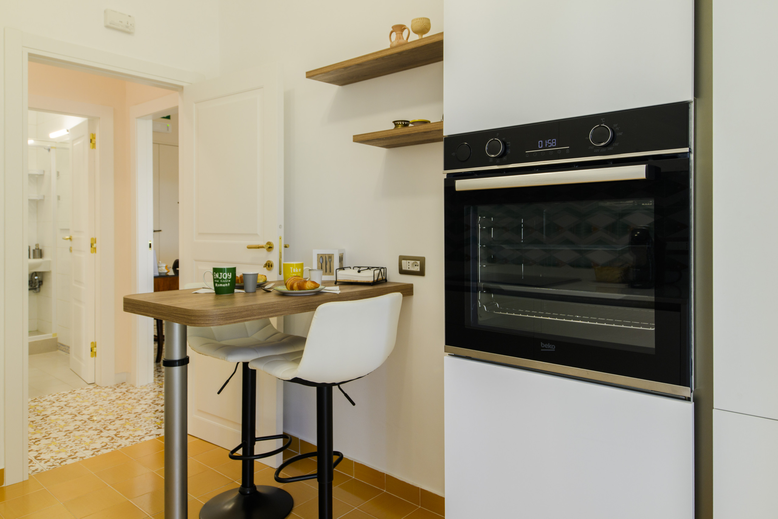 Cucina attrezzata con lavastoviglie, frigo, congelatore, forno, piano cottura ad induzione, macchina del caffé e bolittore.