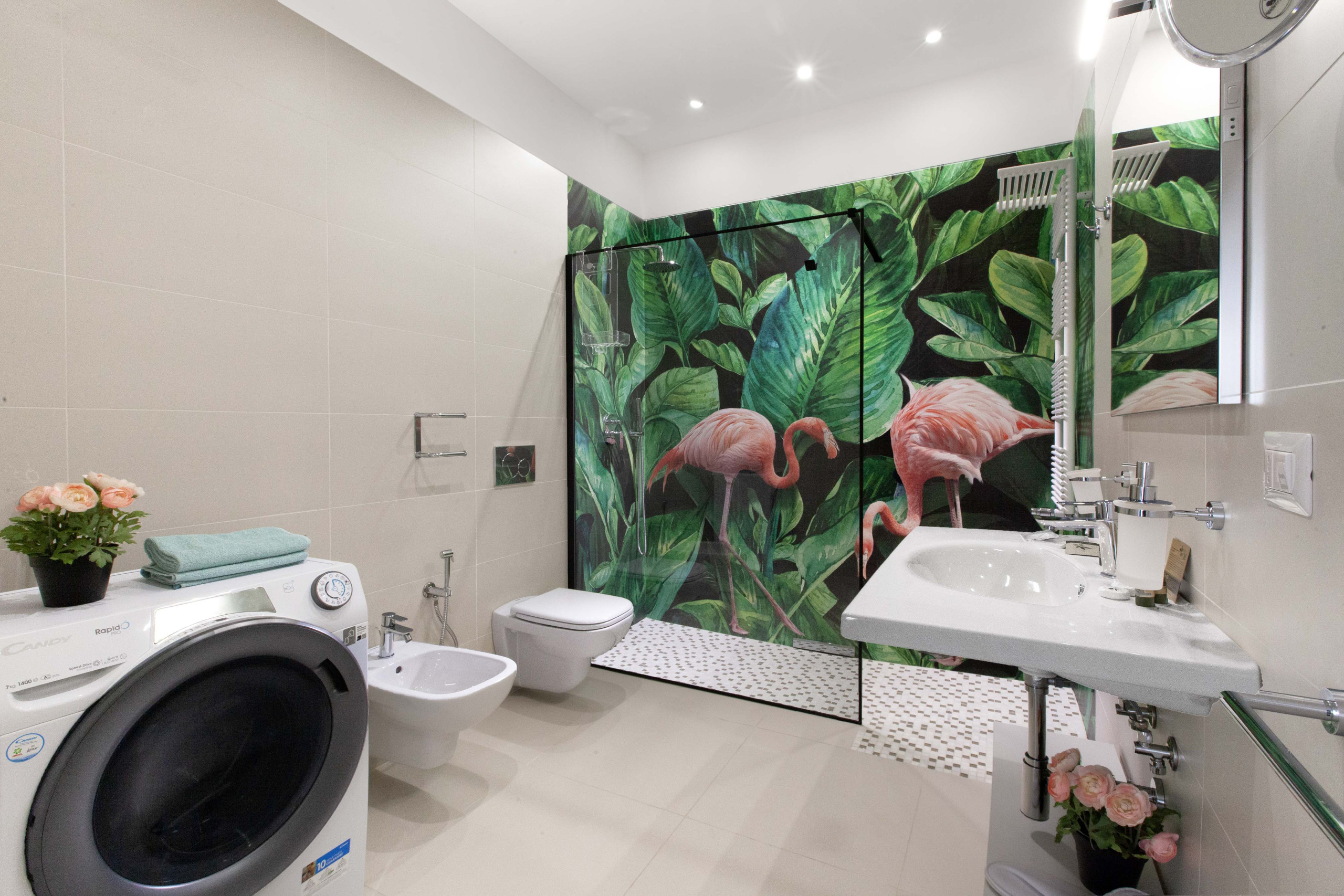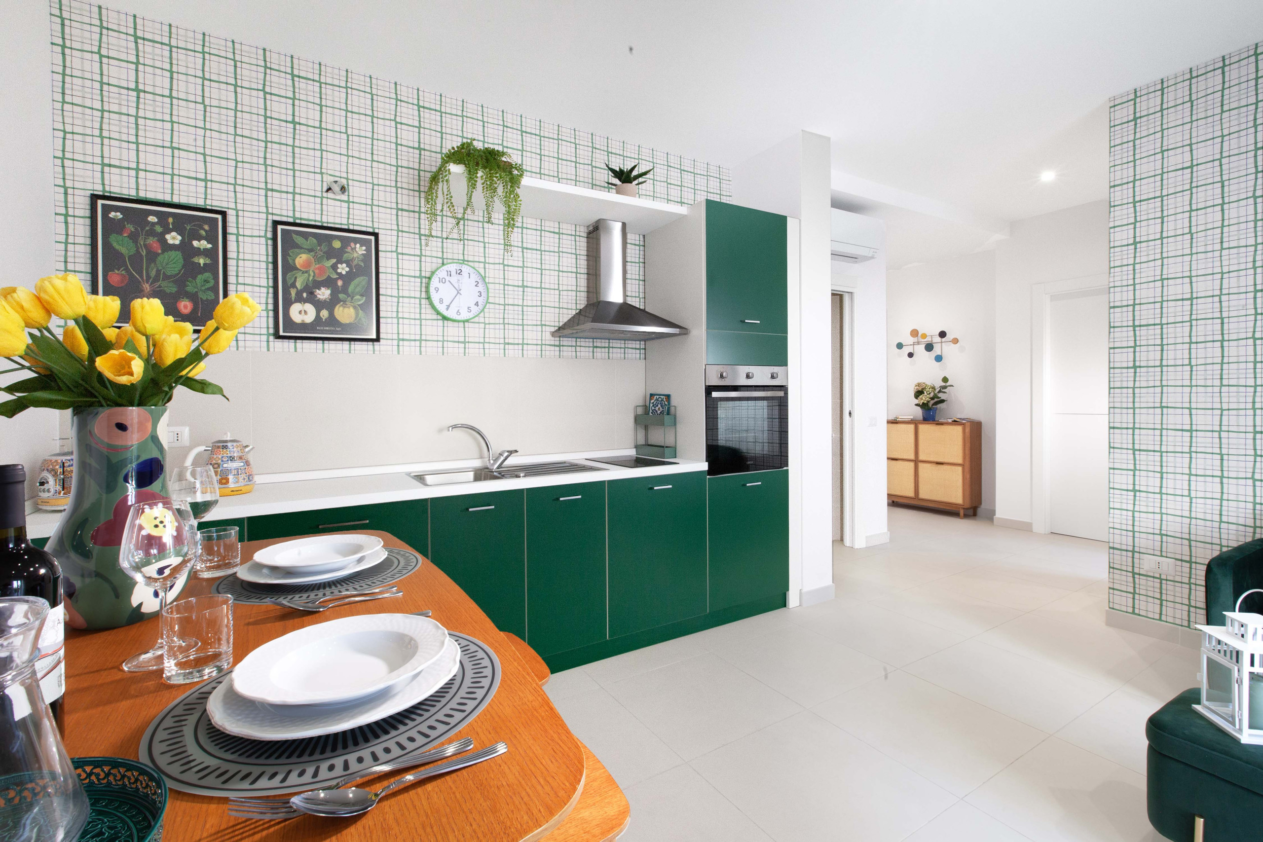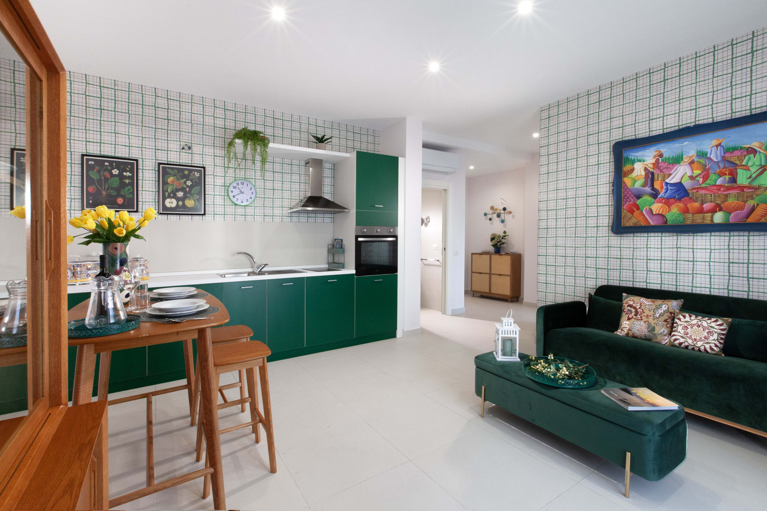L’appartamento, arredato in raffinato stile anni ’50 con delicati toni del verde e del rosa, offre un’atmosfera accogliente e ricercata. È composto da un luminoso soggiorno con cucina americana completamente attrezzata con piano cottura a due fuochi ad induzione, lavabo, frigo, lavastoviglie. Una luminosa camera da letto con letto king size confortevole, un ampio bagno completo, moderno e funzionale completo di wc, bidet con doccino, ampia doccia walk-in, lavatrice e ampio lavandino. Gli arredi personalizzati valorizzano ogni spazio con carattere e unicità.
