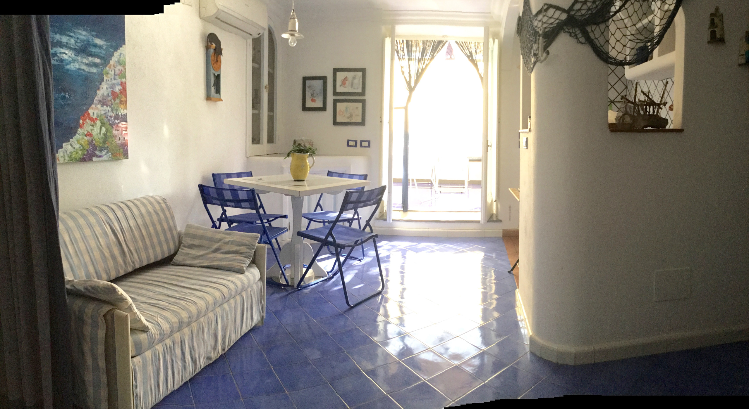 Entrando troviamo una luminoso ambiente living composto da sala da pranzo attrezzata con tavolo e sedie per quattro persone, divano in tessuto color acquamarina, smart tv 55 pollici a schermo piatto, cucina americana con piano cottura a gas, doppio lavabo in acciaio, tostapane e kettle, microonde e forno elettrico, cappa di aspirazione e macchina del caffé con cialde. L'ambiente living è arredato con i toni del verde mare, azzurro e blu, con ceramiche tipiche vietresi. Dal soggiorno si accede all' ampia camera da letto: questa è caratterizzata dai soffitti a volta, dal balcone vista mare ed è composta da due ampi spazi condivisi.