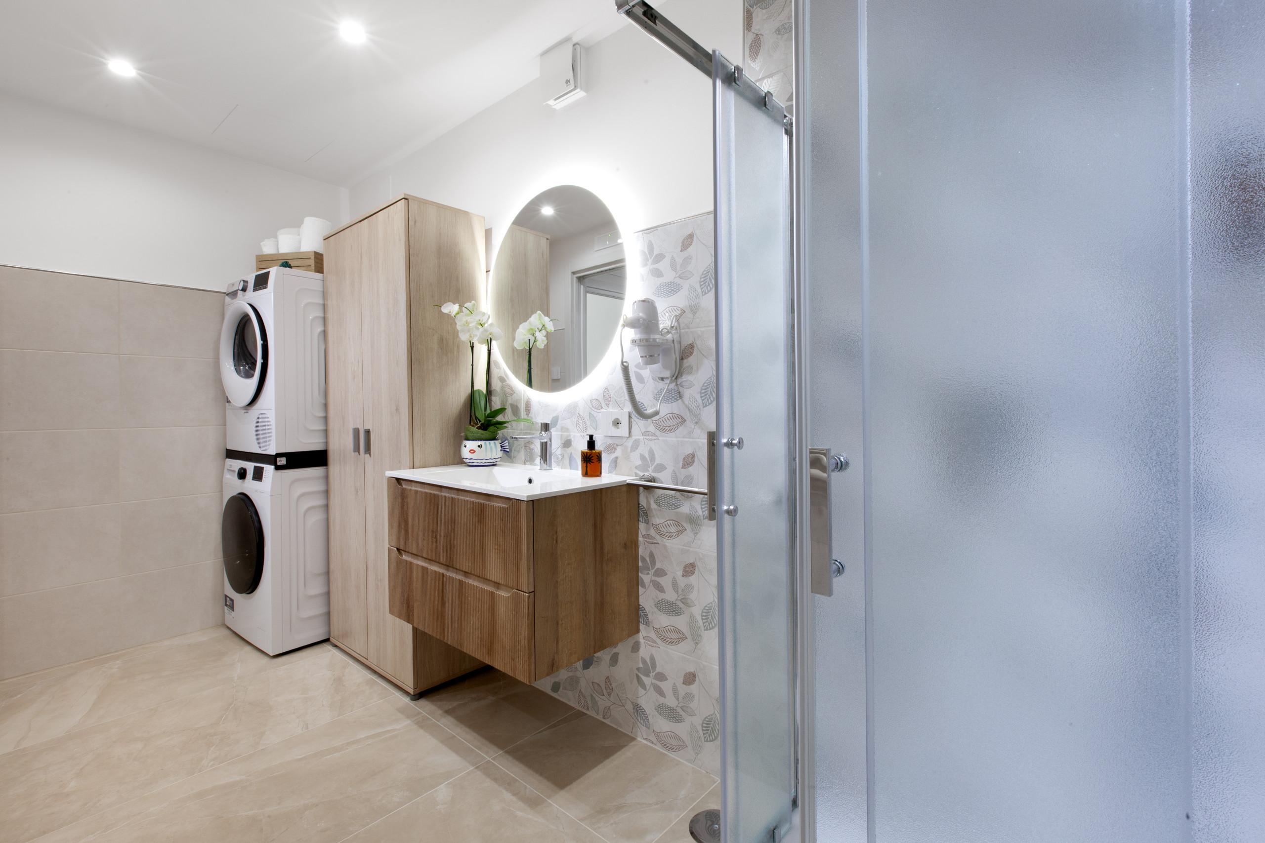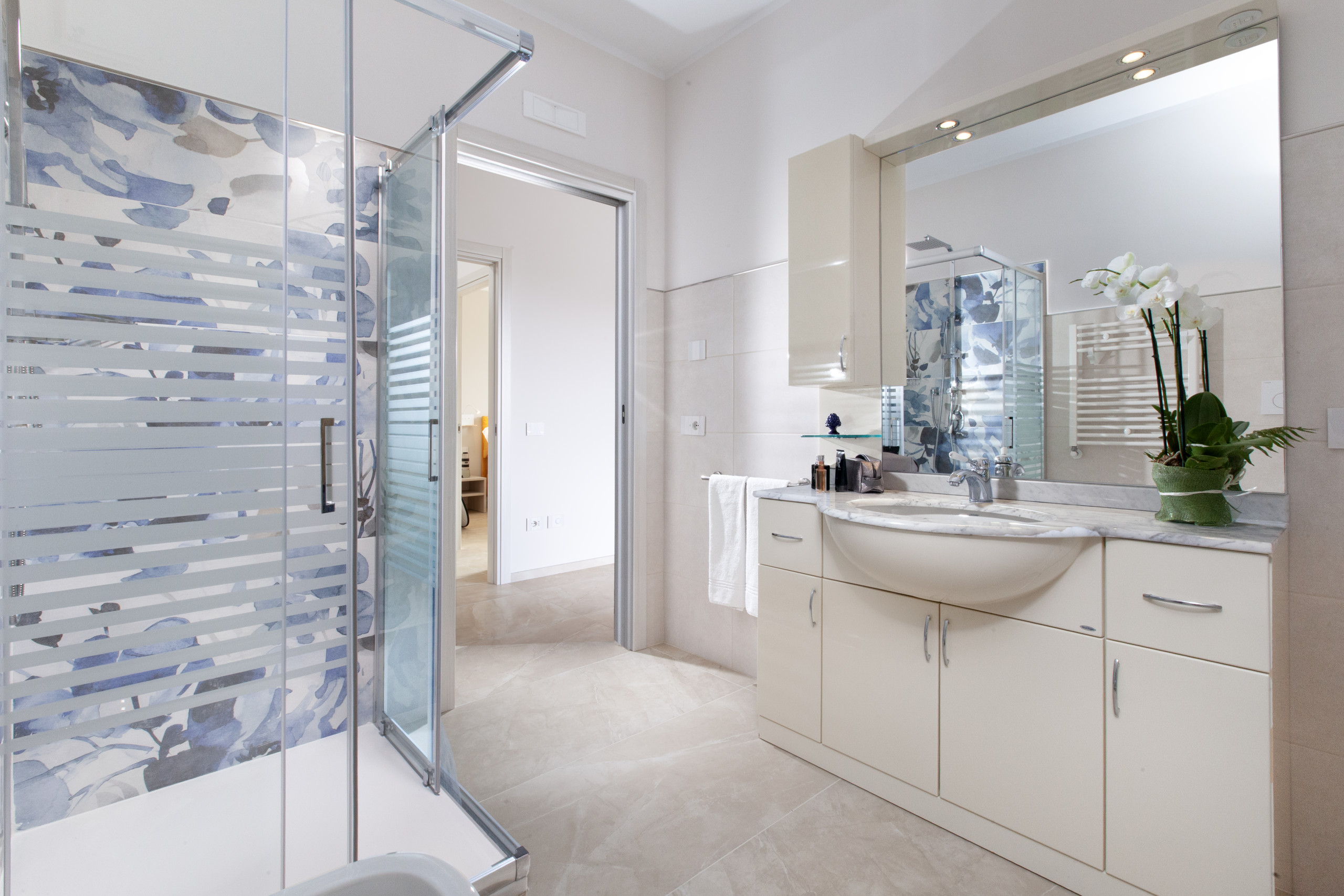 La cucina, completamente nuova e attrezzata in ogni dettaglio, è uno dei veri punti di forza della villa. Dispone di piano a induzione a cinque fuochi, forno elettrico, forno a microonde, frigorifero e freezer, wine cooler, macchina del caffè a cialde, bollitore e tostapane. Il grande piano di lavoro frontale la rende ideale non solo per cucinare, ma anche per vivere vere esperienze culinarie, come lezioni di cucina organizzate direttamente in villa. Su questo livello è presente anche un bagno con doccia, lavatrice, asciugatrice, ferro e asse da stiro.