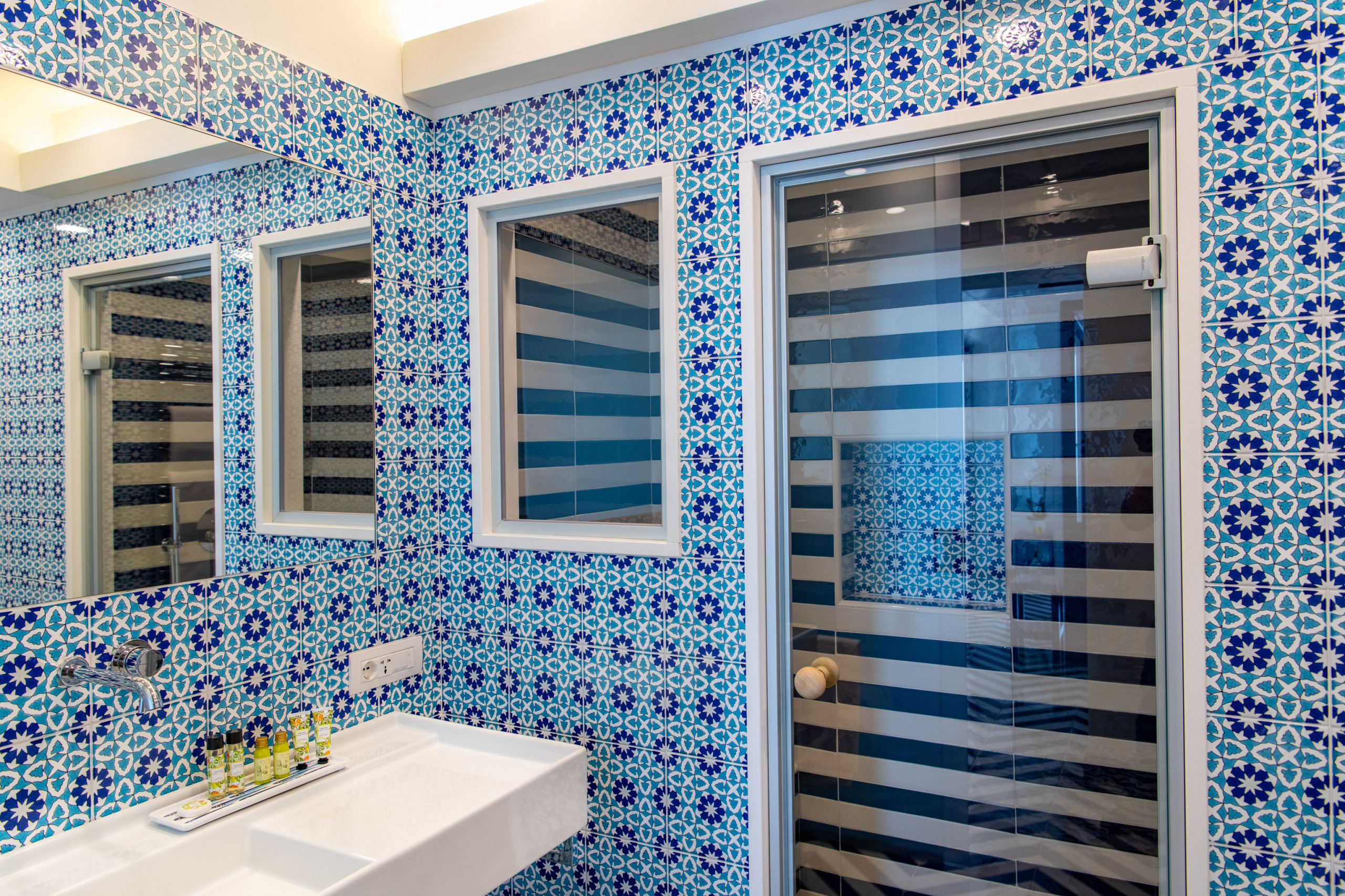 La seconda camera da letto, con bagno completo in camera, di cui un’ampia doccia walk-in, armadio a giorno in maioliche blu e gialle, poltrona in velluto. Questa camera risulta anche di essere di passaggio per accedere alla terza e ultima camera, con letto queen size, testiera in stucco e maioliche, ampio bagno privato in camera.