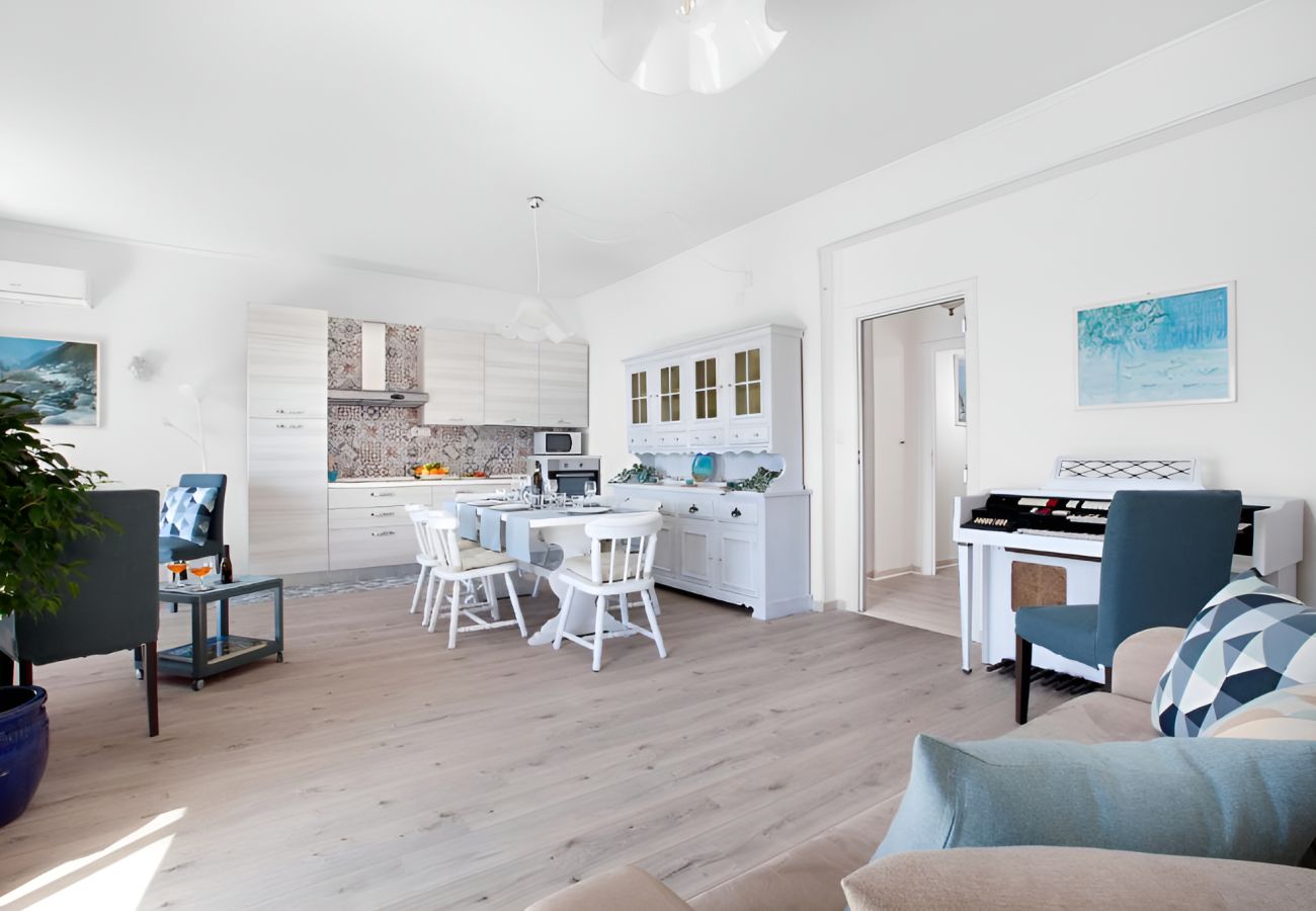 The apartment has two bedrooms with double bed, flat screen TV, one with balcony and one with window, both equipped with air conditioning. The living area, spacious, bright and tastefully furnished has access to the balcony with sea view, sofa bed, fireplace, a large dining table, flat screen TV, air conditioning and kitchen equipped with fridge, oven, microwave, citrus juicer, toaster, kettle, coffee maker and induction hob and all the necessary utensils.