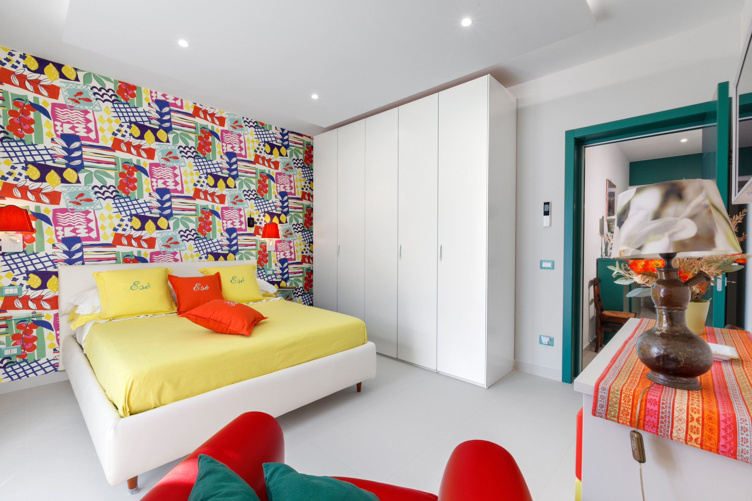 Upon entering we find a kitchen, a bedroom with a spacious double bed, a bathroom with shower and wardrobe. The room has a private external terrace overlooking Via Marziale. Everything is decorated in shades of blue and yellow.