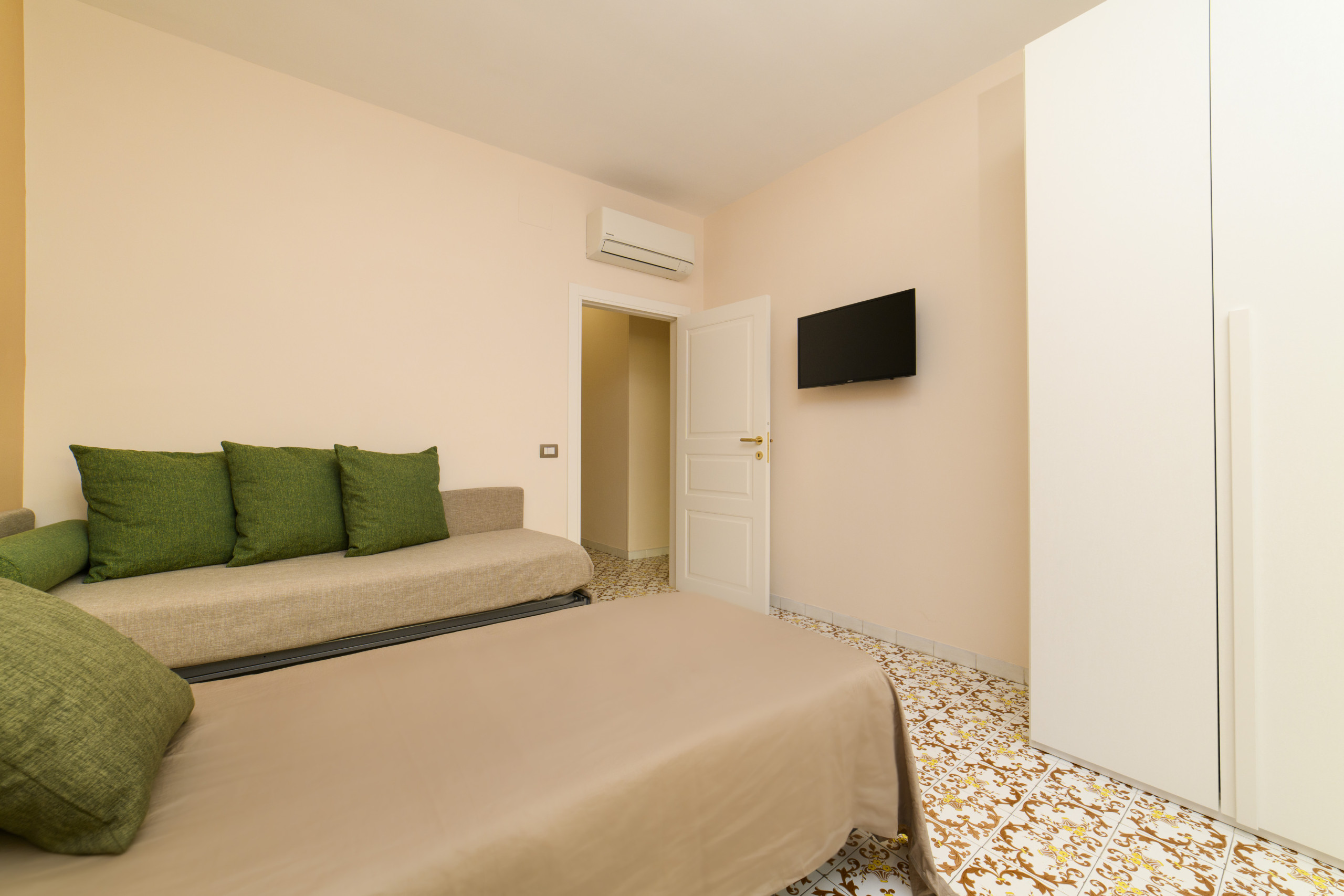 • Two spacious bedrooms, furnished with style and equipped with every comfort. One room has a king-size double bed while the other has 3 single beds.