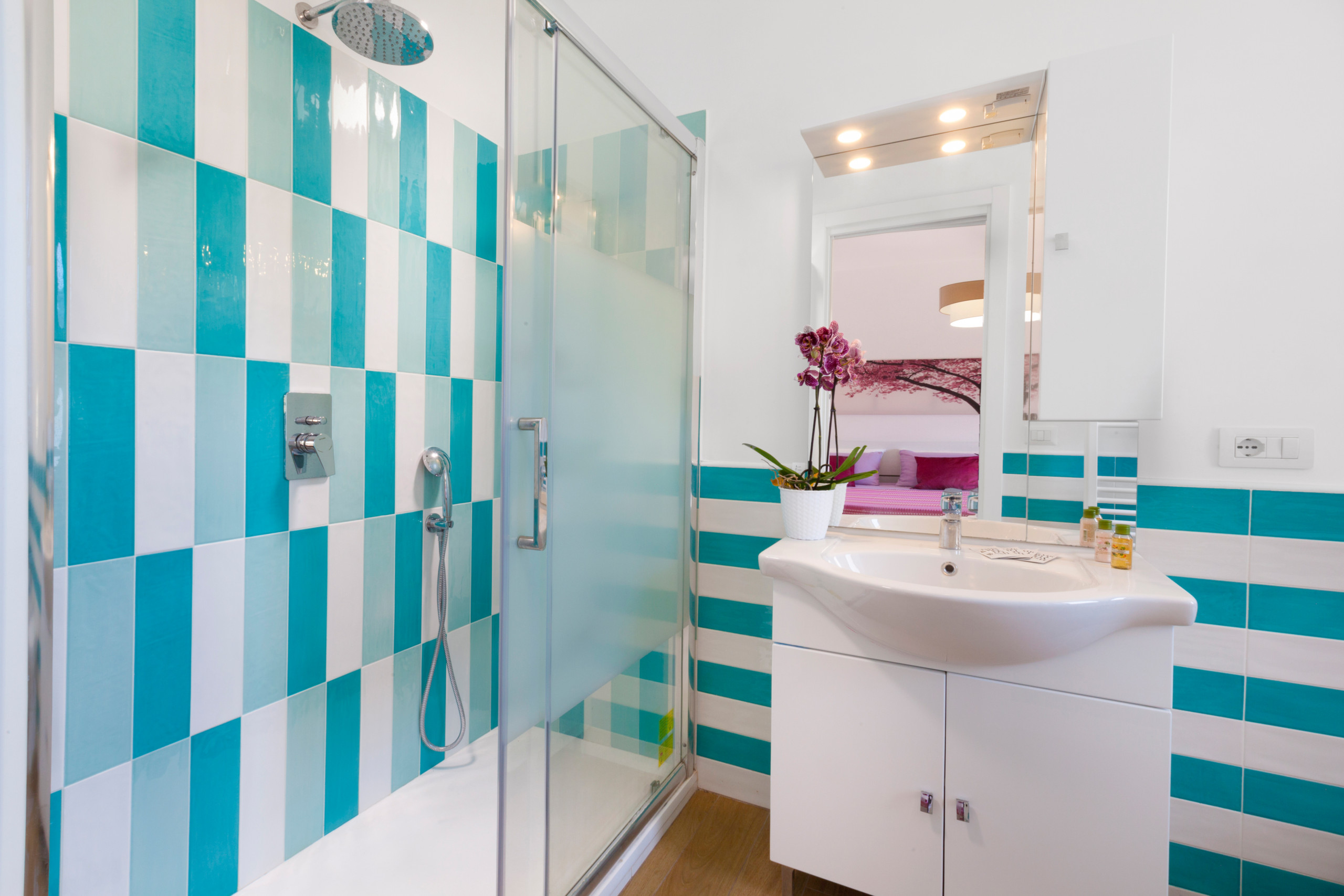 Design flat- Pesce is a suite with kitchenette located in Piano di Sorrento, on the fourth floor of a building with a lift. The entrance immediately takes us into a unique environment, with the large memory double bed in the center, table with chairs outside on the terrace. The room is luxurious and modern, embellished with particular sculptures. The bathroom, created in shades of gray and blue, combines tradition with modern style. Next to the bathroom, we find a free-standing tub.