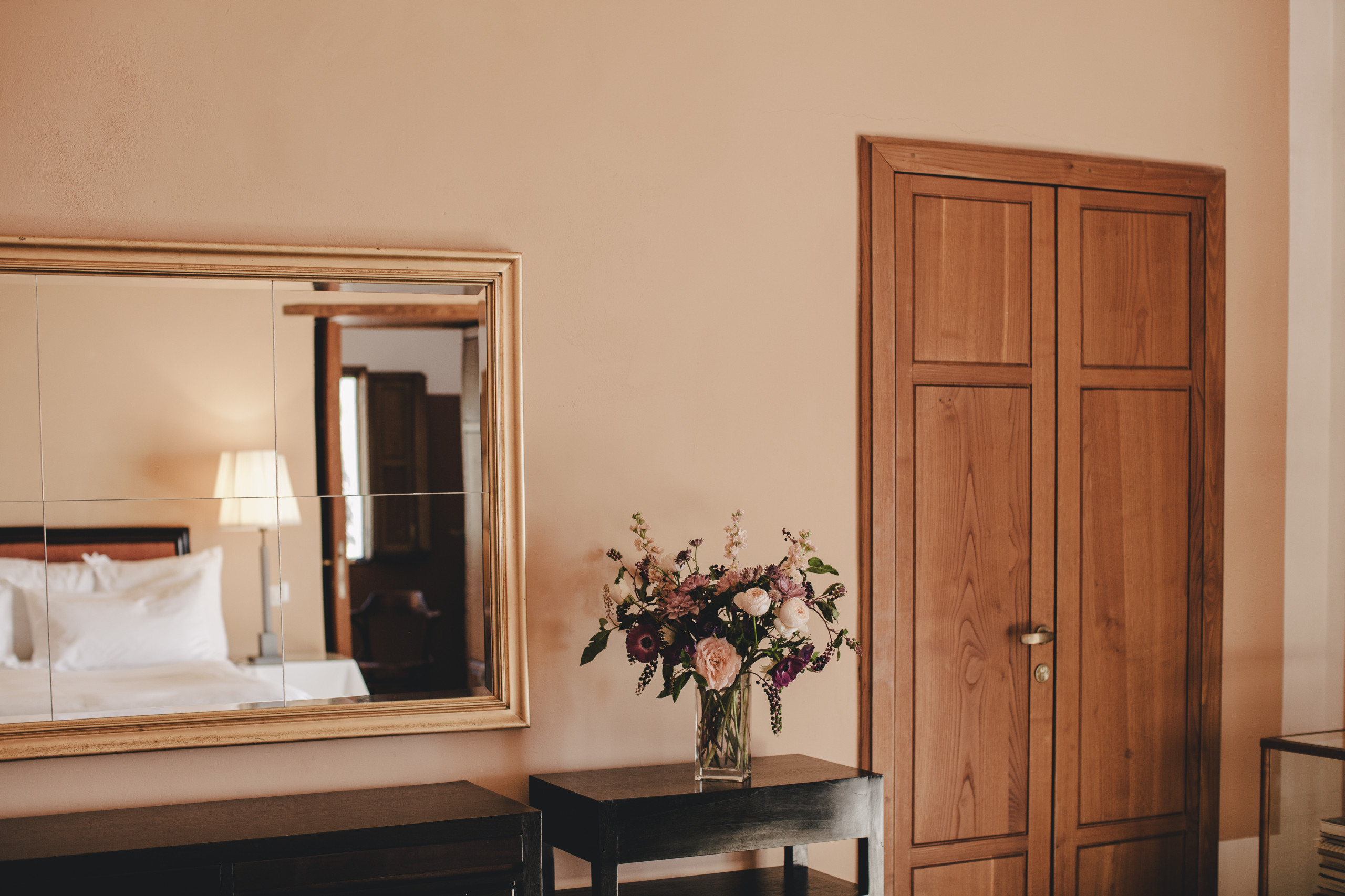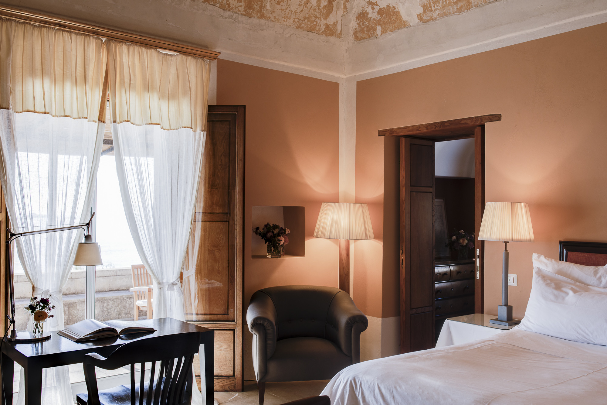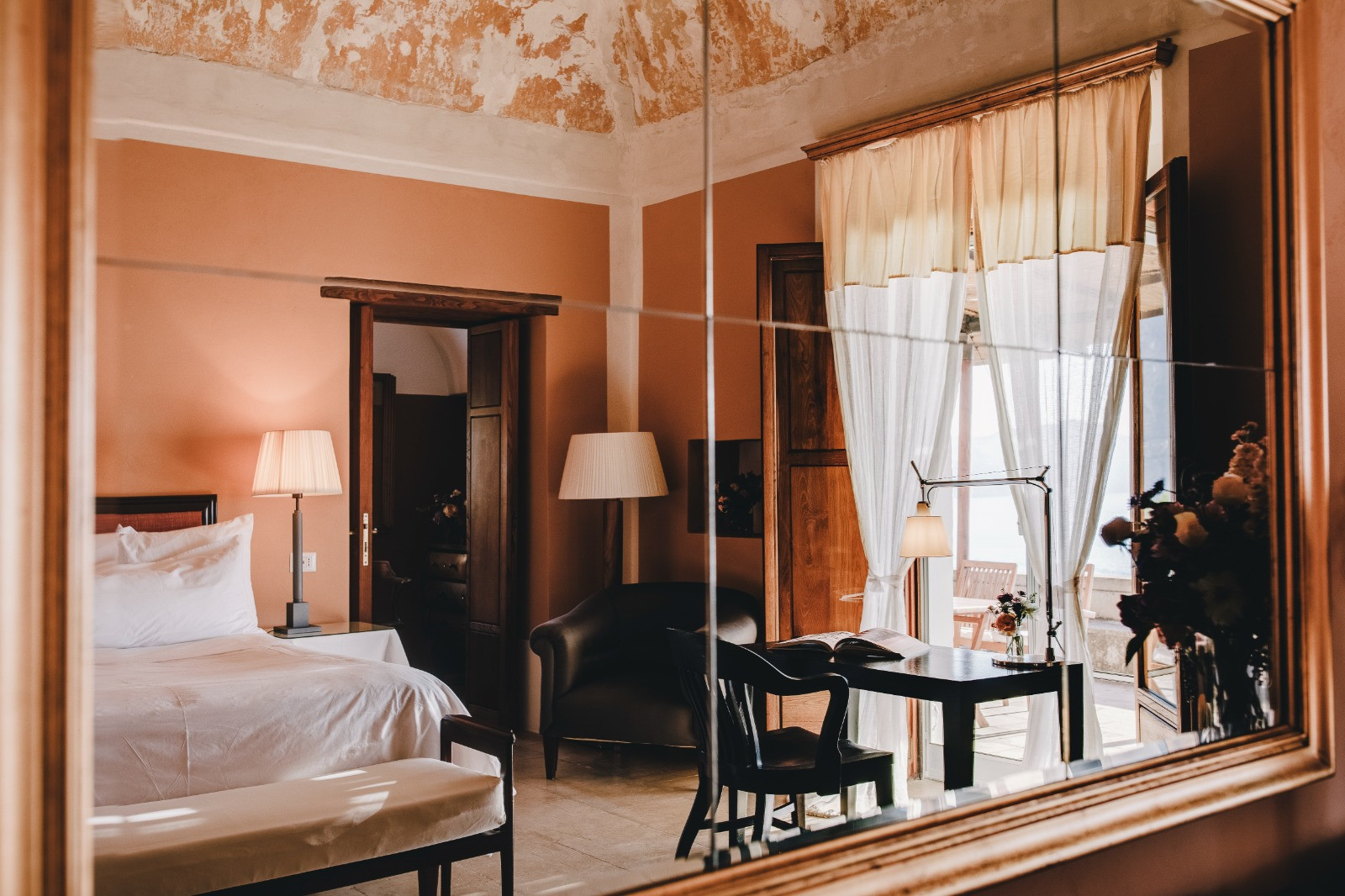 This spacious corner double room with terrace is located on the top floor. Its name derives from the walls with soft golden tones and some of the original frescoes present on the dome: lying in bed, one can lose themselves gazing at them.