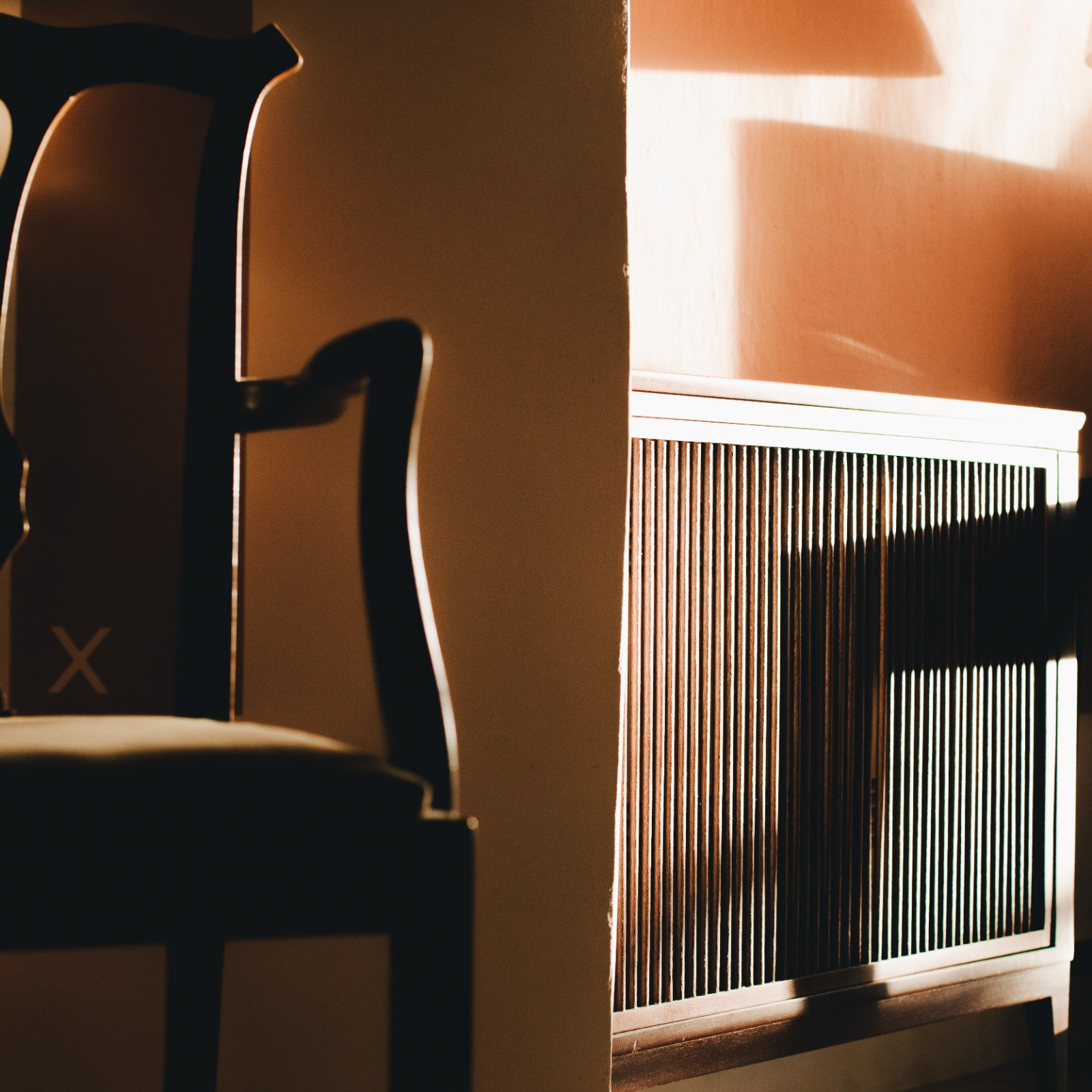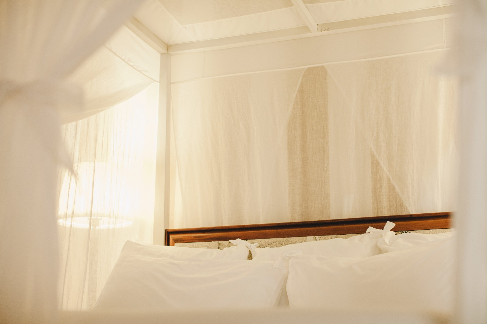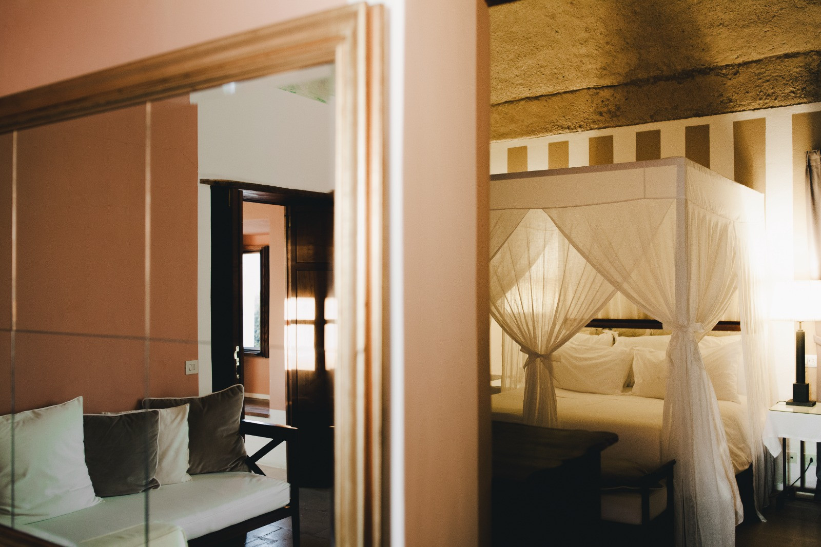 From one of the side entrances, you access the living room directly through the entrance hall, situated on the front side of the house. The living room features a large window facing a very long desk, from which you can enjoy a splendid view of the garden and the sea. Here you can rest, meditate, read or simply relax and admire the frescoes on the ceiling. The living room leads to the bedroom, which is located in the centre of the house and is therefore slightly darker and cooler.