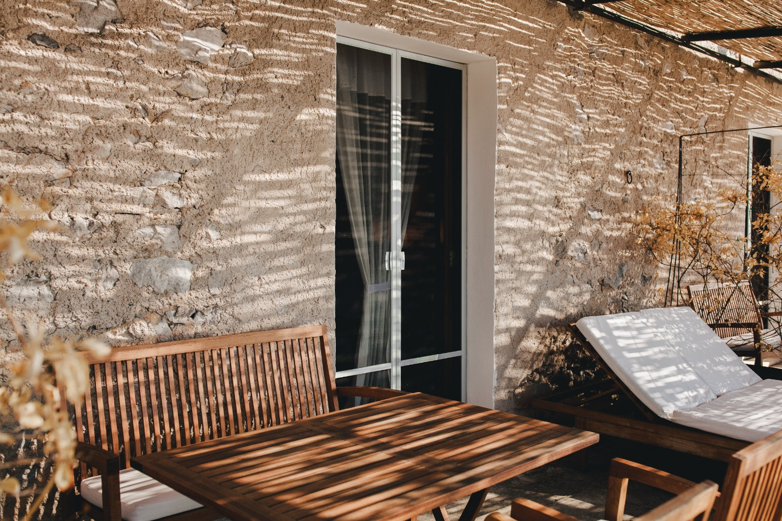 Although this is the only room in which it was not possible to create an internal private bathroom, it still has a private bathroom just a few steps from the entrance and is one of our favourite rooms in the house. You just need to get out of bed and step directly onto the terrace to wake up and enjoy the magnificent view of the mountains, the sea and the garden below. The terrace is furnished with a double sunbed, a large table and chairs.