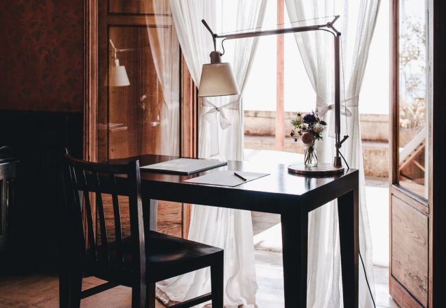 This central bedroom on the top floor offers a spacious terrace with an unparalleled view of the Amalfi Coast and Capri. The walls in an intense and sober red, embellished with hand-painted frescoes, give this bedroom a special and welcoming atmosphere that makes you feel at home.